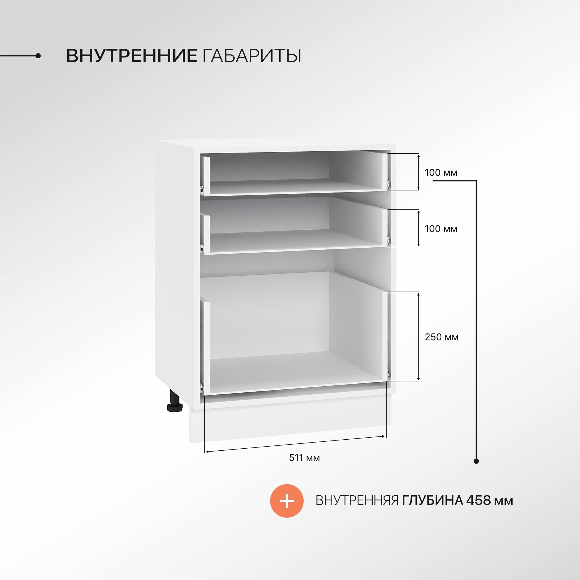 Регулируемые опоры в комплекте с достаточным диапазоном регулировки помогут при установке модуля на не подготовленное и не ровное основание. Цоколь закрывающий ножки поставляется в комплекте и производится в цвете корпуса напольного шкафа.