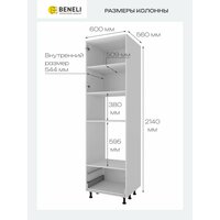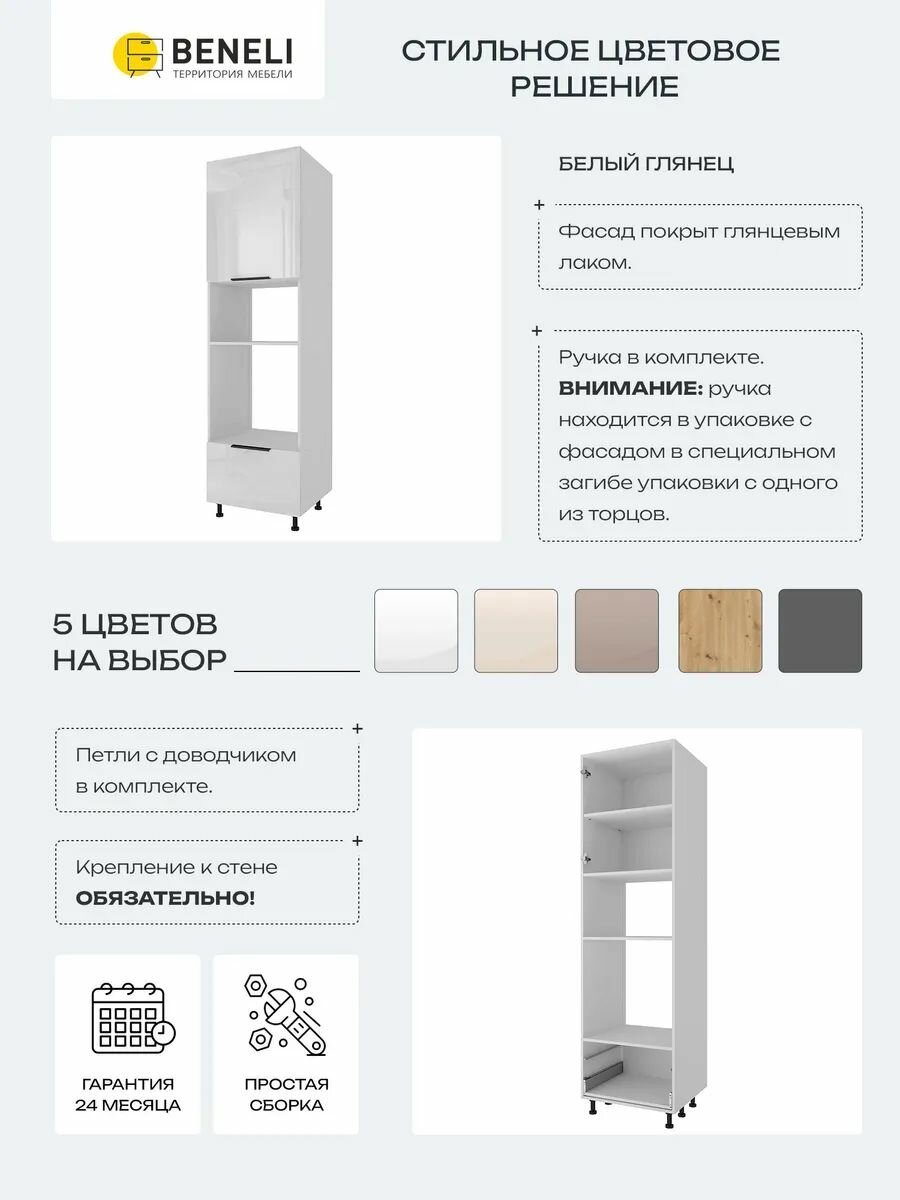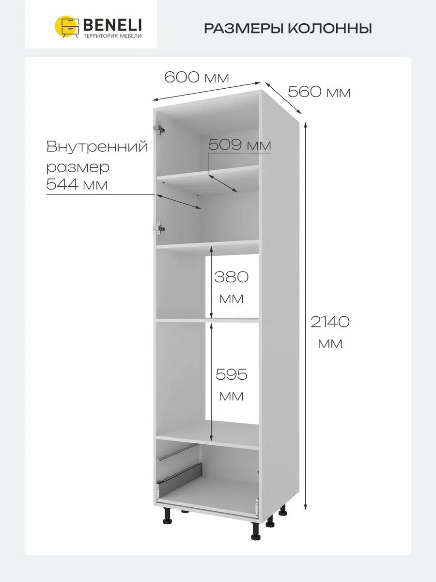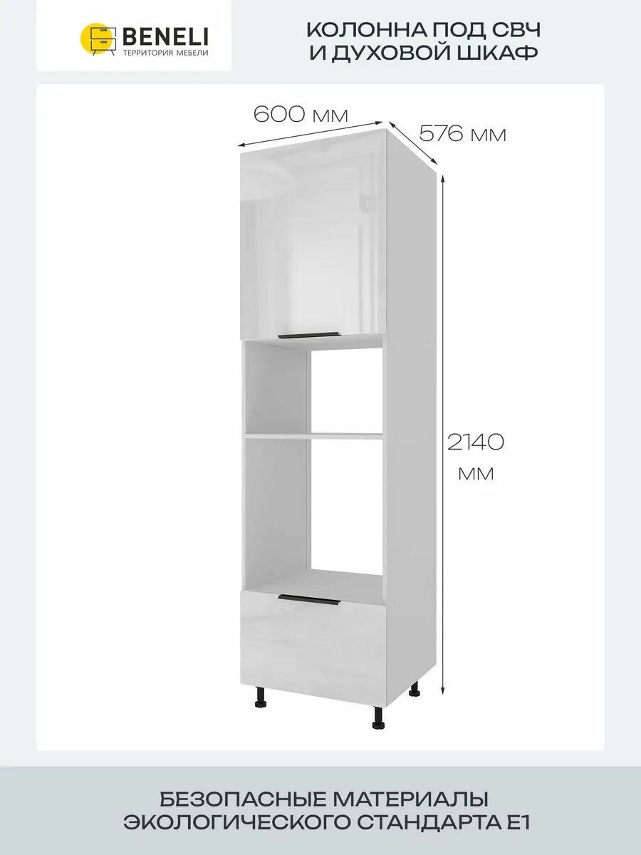 Кухонный модуль шкаф напольный колонна под свч и духовку Beneli COLOR Белый глянец/Белый 60х576х214 см Кухонный шкаф пенал колонна под холодильник духовку свч и другую бытовую технику поможет воплотить Ваши мечты о стильном интерьере кухни, хостела, гостиницы, общежития и дачи. Шкаф пенал для кухни многофункциональный станет отличным выбором мебели для тех, кто ценит качество и эргономичность. Корпус, фасады и фурнитура от проверенных фабрик.