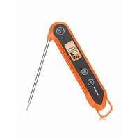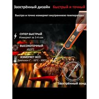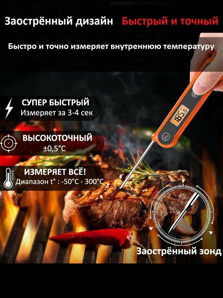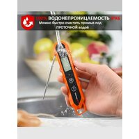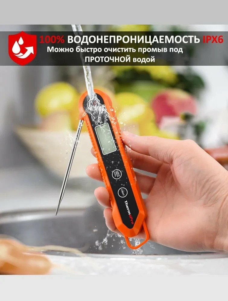 Зонд с точностью 0,5°C. Скорость считывания 3-4 сек. Водонепроницаемый. Магнитный корпус. LCD-дисплей с подсветкой. Автоотключение. Фиксация показания температуры.