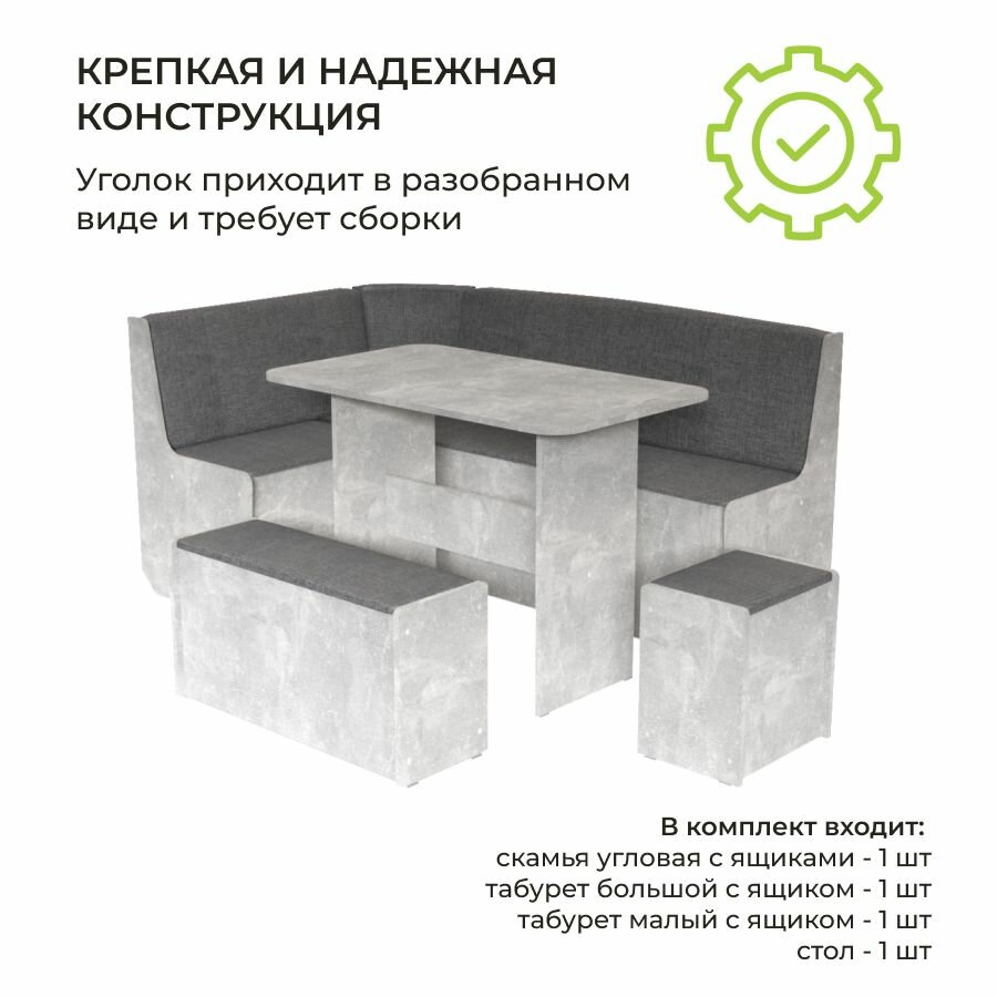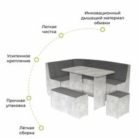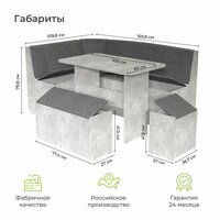 Особенность комплекта для кухни заключается в наличии большого количества ниш для хранения. Под сиденьями скамьи, большого и малого пуфов расположены глубокие ящики. При этом Кухонный уголок «чикаго» выглядит очень гармонично и презентабельно.