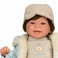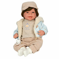 Эксклюзивный процесс создания этой куклы мальчика включает прорисовку мельчайших деталей: венок, складочек и бровок. У этого малыша карие глаза (не закрываются), обрамлённые длинными ресничками, милые веснушки на щёчках, придающие ему живой и очаровательный вид. Мини реборн одет в сине-бежевую кофточку в тон вельветовым брюкам и кепке. Кукла с аксессуарами, в комплекте также идёт соска. Эта живая кукла смеётся, если нажать на её животик, наполняя каждую игру весельем и радостью.