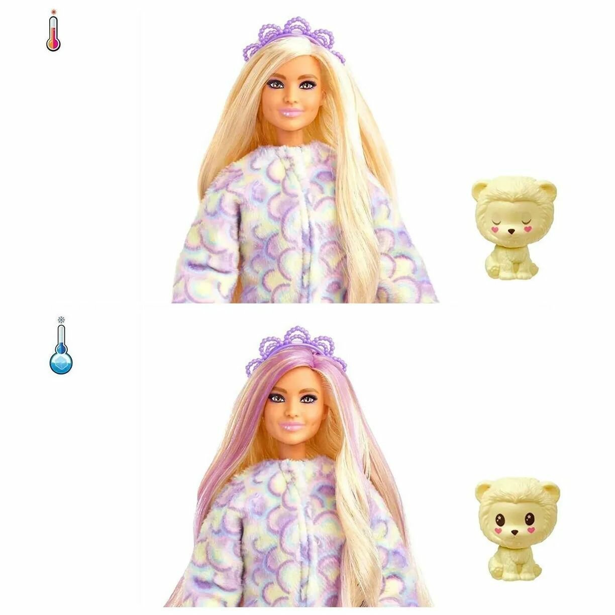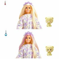 Пришло время преобразиться с изменением цвета. На лице Барби макияж в стиле животных, а ее милый плюшевый мишка открывает и закрывает глаза. Чтобы активировать смену цвета, достаточно использовать холодную воду и губку-расческу. Используйте теплую воду, чтобы вернуть ей первоначальный вид.