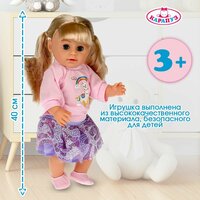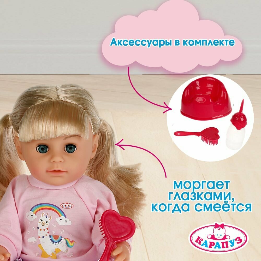 Милая кукла с детально проработанным личиком обязательно понравится малышке. Анфиса одета в розовую кофточку с милой аппликацией в виде ламы и яркую юбочку из ткани с пайетками. Одежда легко снимается и надевается. У куклы длинные красивые волосы, которые собраны в 2 хвостика, хозяйка куколки легко сможет распустить их и сделать Анфисе причёску по своему желанию, для этого в наборе имеется расческа.