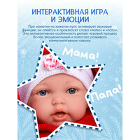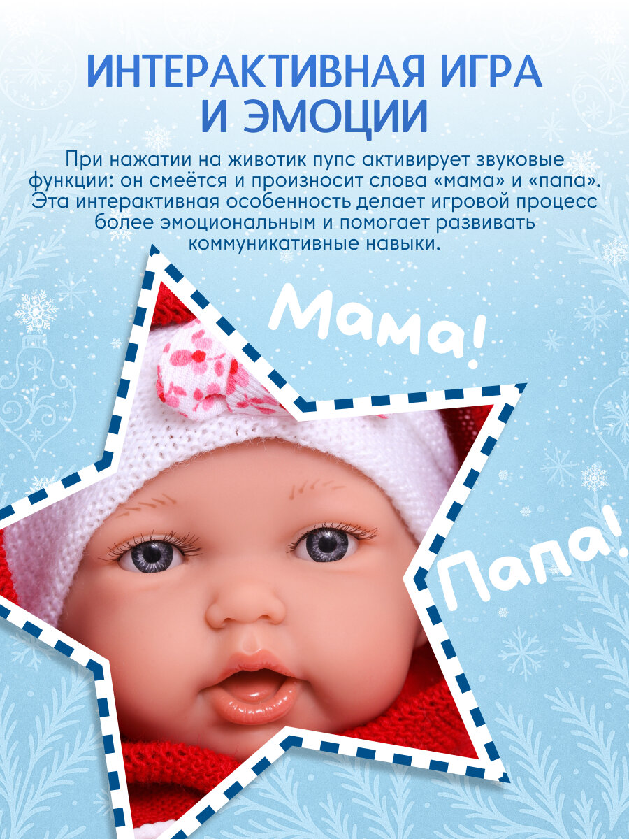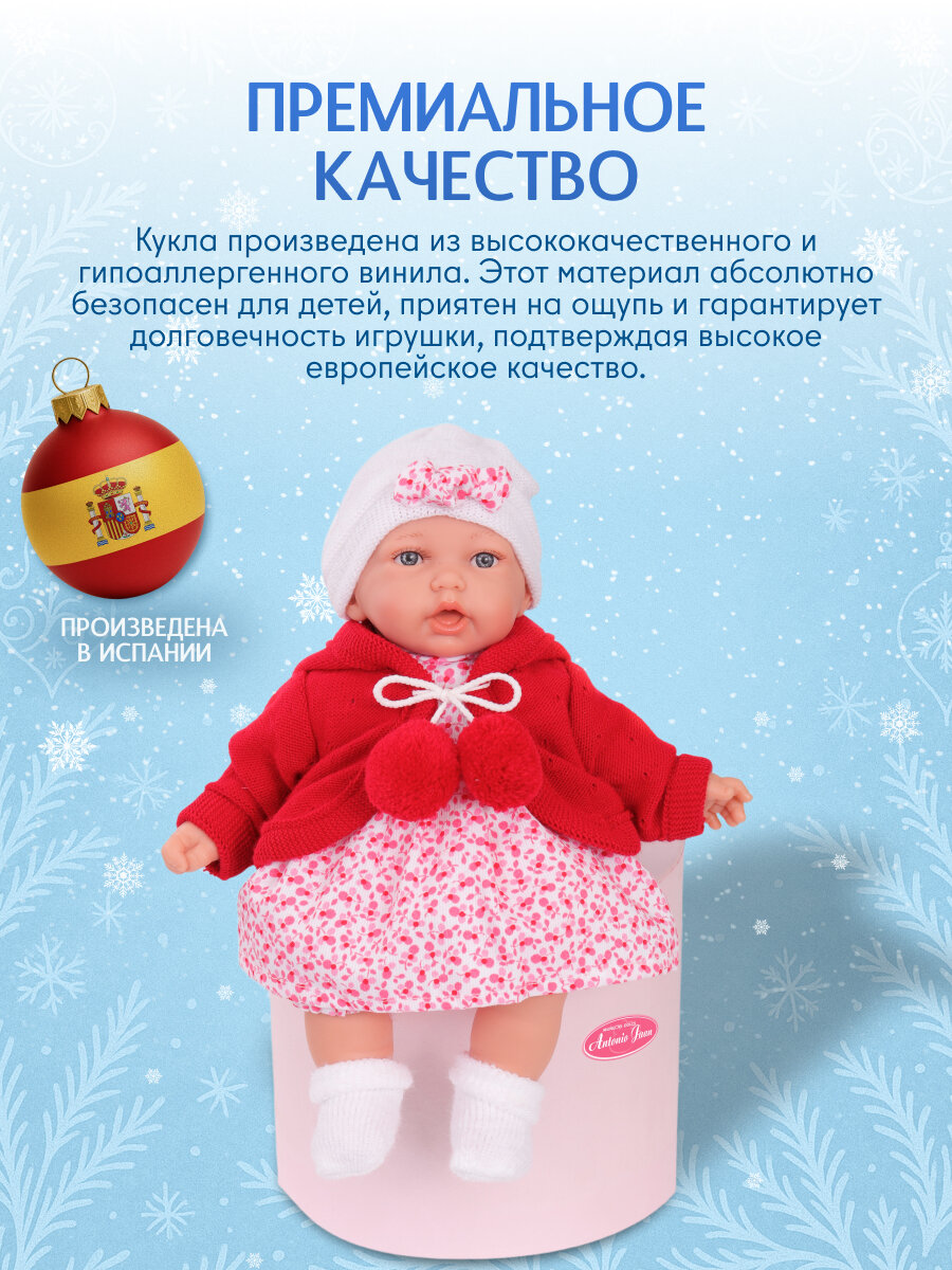 Милая Азалия - озвученная кукла испанского бренда Мунекас доллс антонио хуан. Если нажать на животик один раз, она начнет смеяться, если нажать два раза, скажет «мама», если нажать три раза - «папа». Кукла Азалия стильно одета, её легко переодевать. Тело куклы мягконабивное, а голова, ручки и ножки из гипоаллергенного винила с бархатистой, как кожа младенца, поверхностью. Знаменитые испанские куклы отличает тщательная проработка деталей. Волосы аккуратно прорисованы вручную. У куклы сияющие серые глаза с длинными ресницами. Удивительно естественное, живое выражение лица и нежный румянец на щеках. Купить мягконабивную куклу Азалию - сделать прекрасный запоминающийся подарок девочке на день рождения и к празднику. Замечательная кукла, похожая на живого младенца, подарит ребенку важный опыт заботы, любви и ответственности.