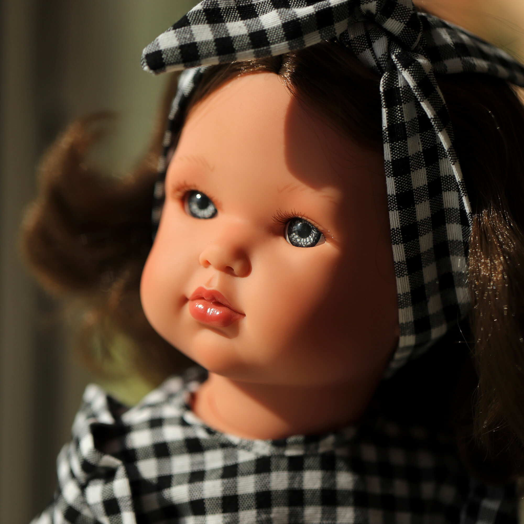 У куклы Белла сияющие серые глаза с длинными ресницами, которые искусно приклеены вручную. Удивительно естественное, живое выражение лица и нежный румянец на щеках делают куклу еще более привлекательной.