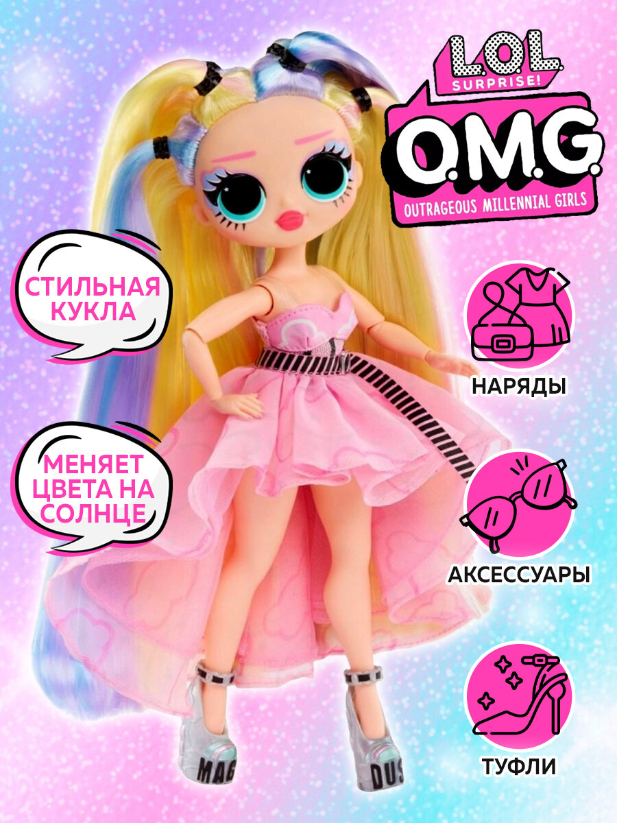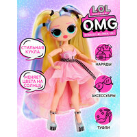 Представляем куклу LOL Surprise OMG Солнечный макияж – Стеллар Гурл! Она – хамелеон, ее образ всегда остается сюрпризом, но что бы это ни было. Вместе со Стеллар Герл вы получите множество сюрпризов, включая меняющие цвет наряды и стильные аксессуары. Выведите Stellar Gurl на улицу в любое время суток, будь то солнце или пасмурная погода, или даже в помещение у окна, чтобы сделать гламурный макияж. На ваших глазах произойдет волшебство, и вы увидите, как цвет ее волос изменится с голубого на фиолетовый. Сможете ли вы угадать, в какие другие цвета превратятся ее блики? Не забудьте посмотреть, как меняются цвета на каждом из ее модных нарядов, которые постепенно раскрываются, когда она выходит на улицу, включая двухцветные джинсы с фиолетовыми сердечками, стильный жакет из сетки с фиолетовыми звездами и модную розовую юбку с меняющим цвет принтом из облаков и звезд. Одевайте Stellar Gurl в разные образы, меняя джинсовую и сетчатую куртку, одевая ее в джинсы, милую розовую юбку или модные голубые шорты, сочетая ее наряд с голубым купальником и розовым топом, и многое другое! Повторяйте смену цвета снова и снова, возвращаясь в помещение, чтобы вернуться к ее первоначальному образу, и снова выходите на улицу или к окну, чтобы увидеть ее великолепные преображения. Модные куклы LOL Surprise со стильными прическами, нарядами и множеством детализированных аксессуаров – идеальная игрушка для детей.