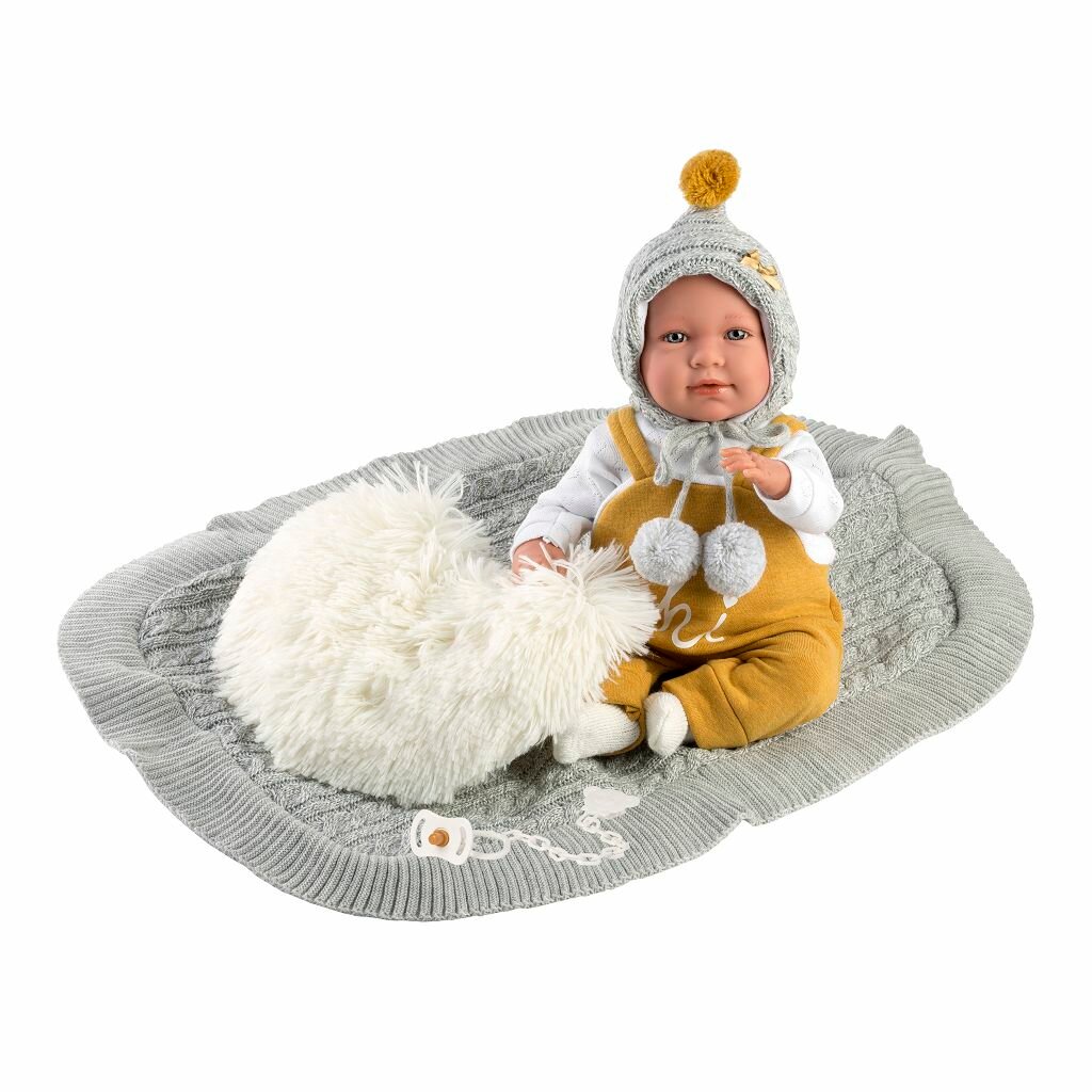 Акриловые глазки (не закрываются). В комплекте соска и мягкая подушка с пледом.