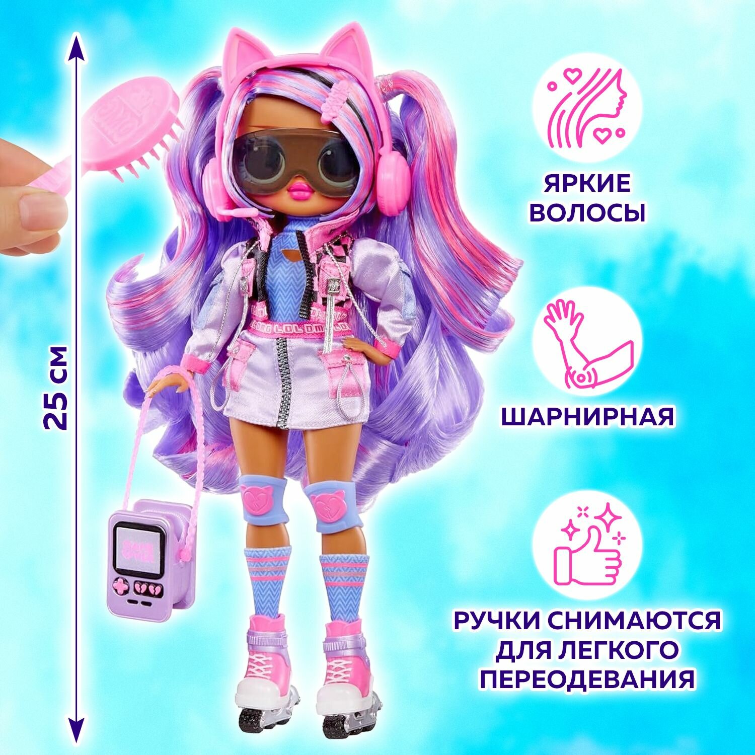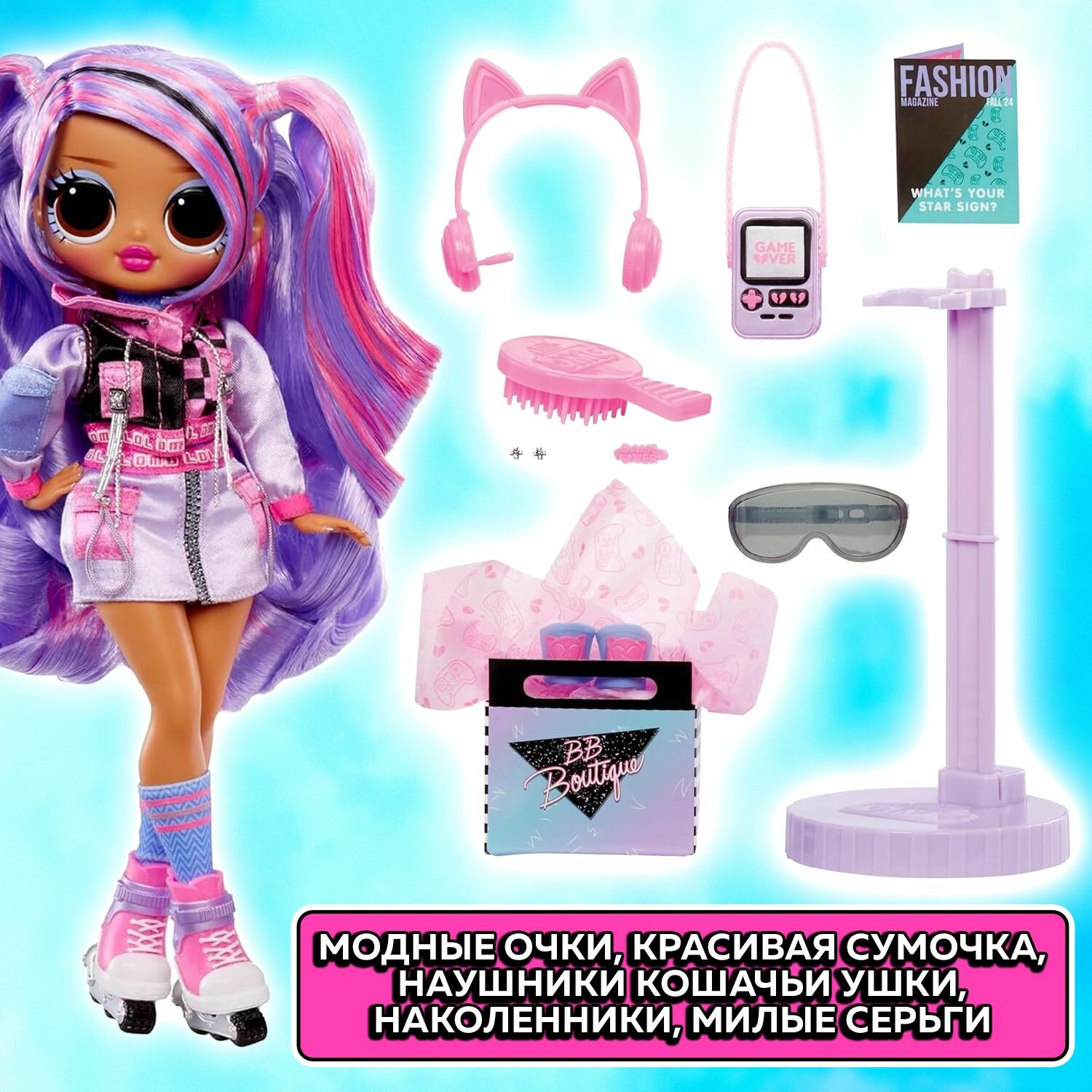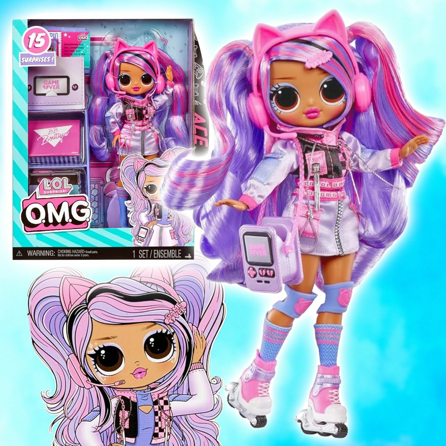 Маркировка MGA Entertainment. Приготовьтесь повысить свой уровень игры в моду с совершенно новой куклой LOL Surprise OMG Ace с 15 потрясающими сюрпризами для распаковки, включая стильную одежду и аксессуары! Эйс – настоящая игровая королева, которая любит проводить время, доминируя в игровом мире и делясь всеми своими секретными трюками со своими лучшими подругами, но как только она выйдет на улицу, вы всегда сможете увидеть ее стильно катающейся по улицам на своих модных, красочных коньках! У нее потрясающие черты лица, красивые волосы, собственный стильный игровой наряд, и она поставляется с шарнирами для множества возможностей позирования. Узнайте, что находится внутри коробки, включая великолепную куклу LOL Surprise OMG, потрясающие наряды, обувь, аксессуары, очки, кошелек, расческу и подставку для куклы. Красивые продукты