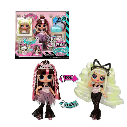 20 сюрпризов, включая головку для укладки, потрясающую модную одежду, носки, туфли, бретельку, тиару, пояс, аксессуары для укладки волос, расческу, подставку для куклы и многое другое!