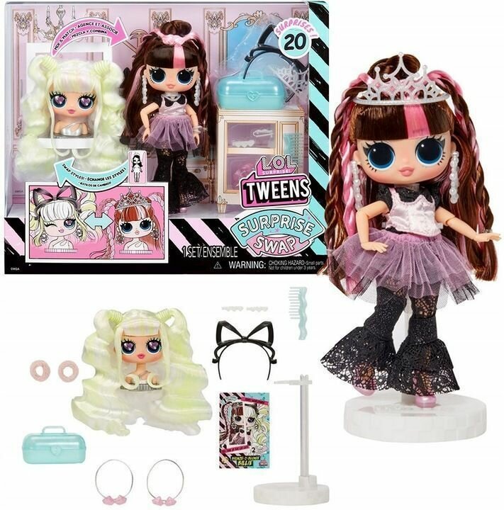 Куклы LOL SURPRISE Swap - стильные подростки, которые любят менять свой внешний вид! Благодаря функции смены голов каждая кукла имеет два уникальных образа. Создавайте стили и персонализируйте образы модных девушек! Кукла Билли Бронза-2-Блондинка меняет свой облик в мгновение ока! Брюнетка или блондинка? Меняйте головы, смешивайте наряды и подбирайте аксессуары. Создавайте бесконечное количество оригинальных творений! Билли известен как любитель кошачьих кафе. Свою любимую кошачью повязку она хранит в милом сундучке. Проверьте, какие еще модные гаджеты входят в набор. Их более двадцати! Содержимое комплекта: