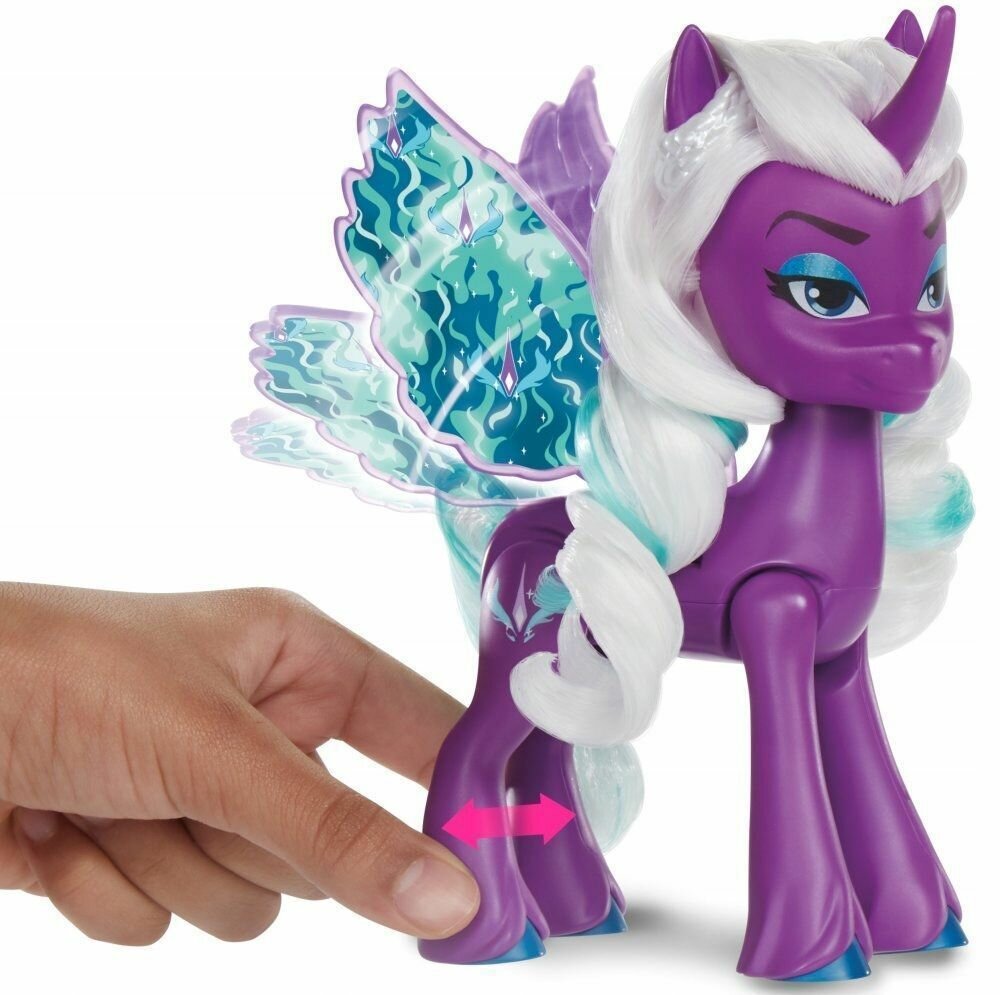 Откройте для себя волшебные секреты с My Little Pony Flapping Wings! Сожмите задние лапы пони, чтобы он махал крыльями вверх и вниз. Представьте себе аликорна, летящего сквозь облака Опалин Аркана - стильный злодей из My Little Pony: Change the World. У фигурки красивые разноцветные крылья, которые можно украсить подвесками Огненного Аликорна. Попытается ли Опалин на этот раз украсть магию пони? Модная пони поставляется с крутыми аксессуарами, с которыми можно играть. Расчешите длинные волосы пони и украсьте копыта Опалайн изящными браслетами.