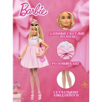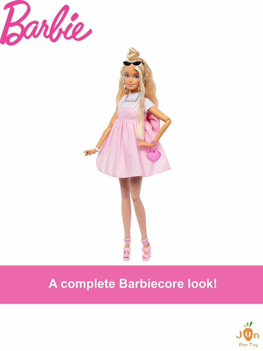 Никто не олицетворяет Barbiecore лучше, чем сама Барби. В фирменном розовом цвете Barbie, эта кукла имеет роскошные светлые волосы, прическу в виде приподнятого пучка! Она одета в пастельное беби-долл платье с большим бантом на спине, которое выглядит великолепно в сочетании с белой футболкой. Розовые колготки в сетку придают ее образу дополнительного шарма! Кукла Барби дополняет свой наряд эффектными украшениями, солнцезащитными очками с перламутром, сумочкой в форме сердца и туфлями с бантом на ремешках. Сгибающиеся суставы позволяют ей принимать разнообразные позы!
