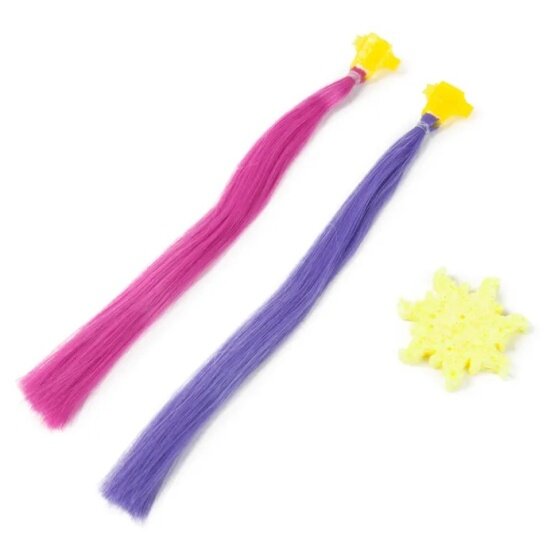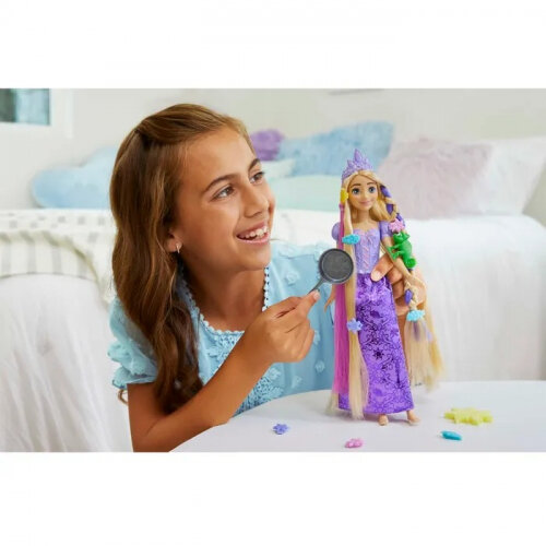 Проявите свою парикмахерскую фантазию в компании куклы Disney Princess Рапунцель! Кукла – в виде главной героини мультфильма «Рапунцель: Запутанная история». Как и в мультике, подвижная кукла Рапунцель носит диадему и фирменное фиолетовое платье с блестящей мягкой юбкой. Знаменитые длинные волосы можно дополнить цветными прядями. Проведите по пряди губкой с тёплой водой, чтобы изменить цвет. Яркие заколки помогут создать самые невероятные причёски. Также в набор входят расческа в форме сковородки и мини-питомец Паскаль.