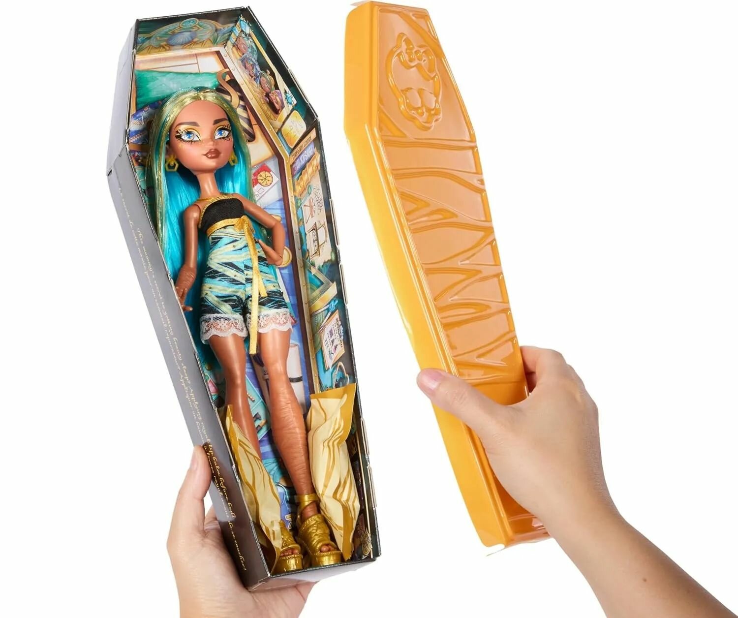 Кукла Monster High Buried Secrets «Волна» 1-3 HYV64 - настоящая загадка, позволяющая детям почувствовать себя участником мистического фильма и раскрыть саркофаг. Скорее разворачивай пелены - кто же лежит внутри? Одна из учениц Школы Монстров со своим питомцем и настоящая модница! На каждой кукле яркий наряд, в набор входит набор аксессуаров: обувь, маска для сна и многое другое для разнообразных ролевых игр.