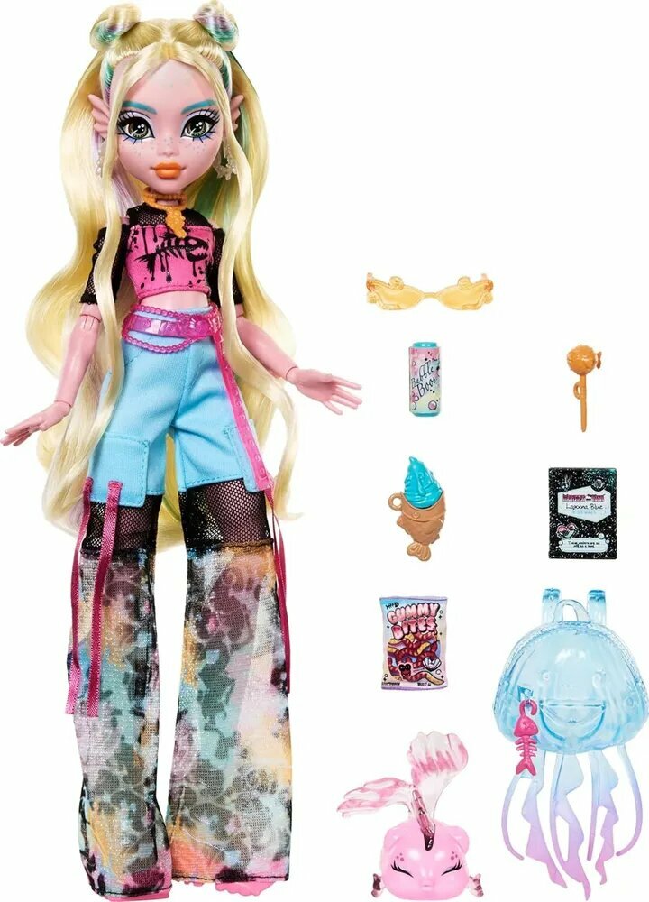 Кукла Monster High Lagoona Blue HXH75 — ученица школы монстров и настоящая модница. Сегодня она выбрала сетчатый топ, украшенный рыбьей костью, трендовые брюки-карго с накладными карманами и сетчатыми вставками и пояс с жемчугом. У Лагуны Блю длинные волосы с цветными прядями, уложенные в актуальную прическу с двумя пучками-ушками. В этом эффектном наряде Лагуна покорит не только океанские глубины, но и любую вечеринку! Вместе с девушкой ее верный питомец: пиранья Нептуна.