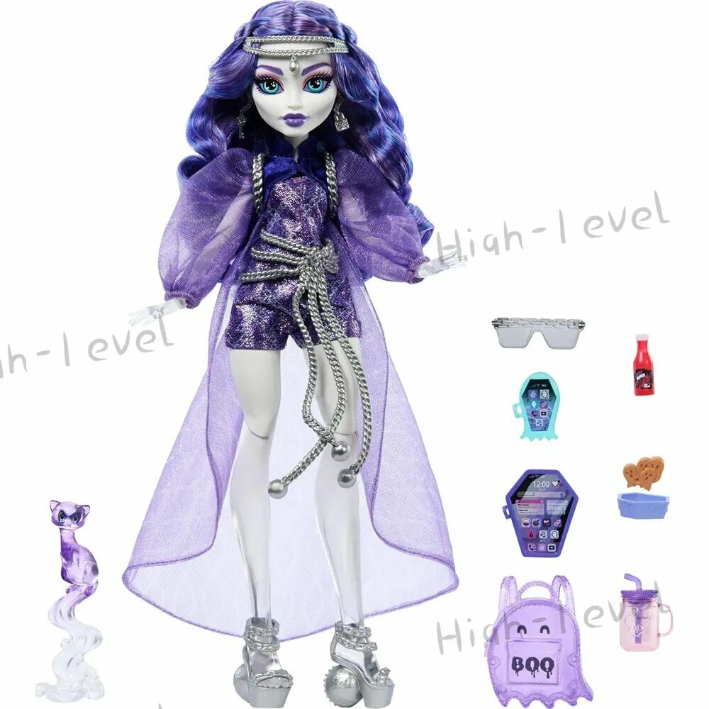 Кукла Monster High Spectra Vondergeist - воплощение призрачного изящества в своем фиолетовом одеянии! В комплекте с ней идет множество тематических предметов для создания жутких сюжетов и стилизации.