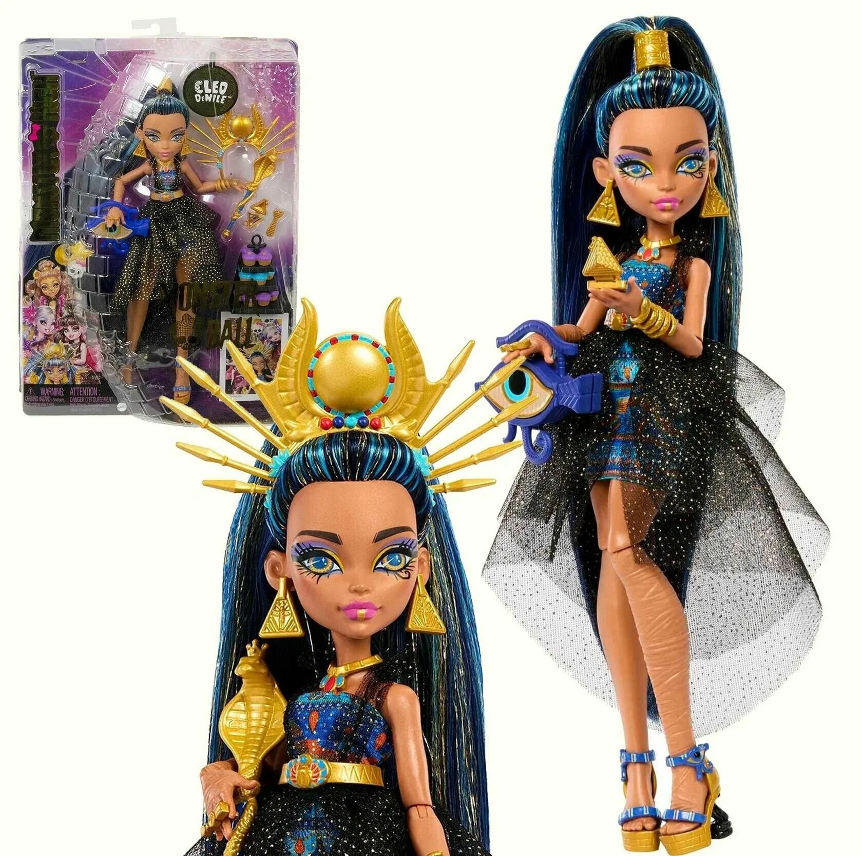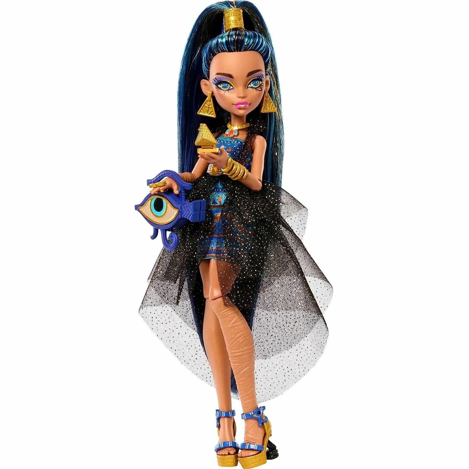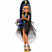 Клео де Нил из Monster High отправляется на бал монстров! Ее сногсшибательный костюм мумии дополнен сумочкой, которая выглядит как глаз Гора. Клео де Нил выходит из своего саркофага, как королева в тиаре со скипетром в руке. Ее блестящие волосы собраны высоко в хвост, а ее серьги-пирамиды, змеиный браслет и туфли на высокой платформе дополняют образ.