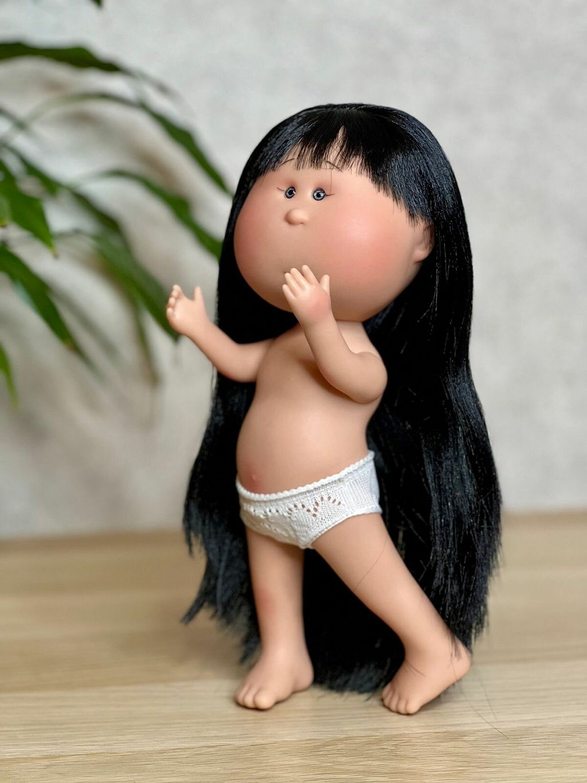 Кукла от Испанской фабрики Nines D'Onil. Девочка полностью виниловая, на прямых ножках. Все части тела подвижны. Без анатомических половых признаков. Кукла имеет легкий аромат ванили. Брюнетка с шикарными, длинными, прямыми волосами (не парик, прошивка по всей голове), можно делать прически. С челкой. Серые акриловые глазки-бусинки, без ресниц (глазки не закрываются). Кукла продается без одежды. Имеет фирменное клеймо, сертификат соответствия. Рост 30см. Упаковка - пакет (без подарочной коробки). Производитель - Испания ( Nines D'Onil ).