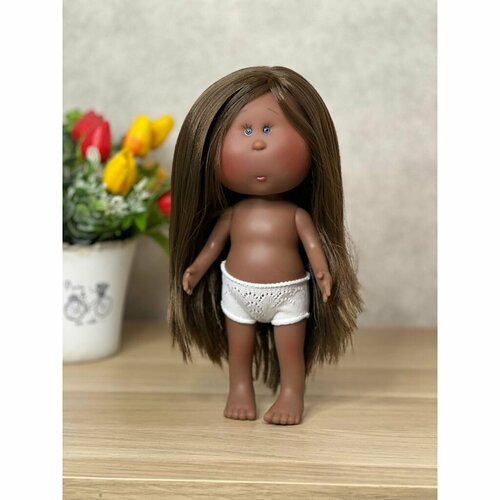 Кукла от Испанской фабрики Nines D'Onil. Девочка, мулатка, полностью виниловая, на прямых ножках. Все части тела подвижны. Без анатомических половых признаков. Кукла имеет легкий аромат ванили. Шатенка с шикарными, длинными, прямыми волосами (не парик, прошивка по всей голове), можно делать прически. Синие акриловые глазки-бусинки, с нарисованными ресницами (глазки не закрываются). Кукла продается без одежды. Рост 30см. Упаковка - пакет (без подарочной коробки). Производитель - Испания ( Nines D'Onil ).