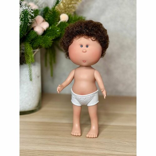 Кукла от Испанской фабрики Nines D'Onil. Мальчик Mio, полностью виниловый, на прямых ножках. Все части тела подвижны. Без анатомических половых признаков. Кукла имеет лёгкий аромат ванили. Шатен с кудрявыми волосами (не парик, прошивка по всей голове). Серые акриловые глазки-бусинки, нарисованные ресницы (глазки не закрываются). Кукла продаётся без одежды. Рост 30см. Упаковка - пакет (без подарочной коробки). Производитель - Испания ( Nines D'Onil ).
