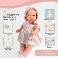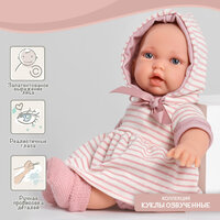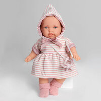 Нам нравится полосатое платье Пети сегодня! Кроме того, она может снять шапочку, когда ей становится жарко. Петит - это кукла, которая всегда счастлива. Petit - кукла со звуковым механизмом, автор Muñecas Antonio Juan. Петит - это кукла с очень дружелюбным лицом. Если потискать ее животик, зовет родителей и смеется. Ее тело сделано из мягкой ткани, чтобы вы могли обнимать ее, а конечности сделаны из мягкого винила. Его размер 27 см, а вес 290 г. С Малышкой очень весело играть!