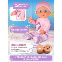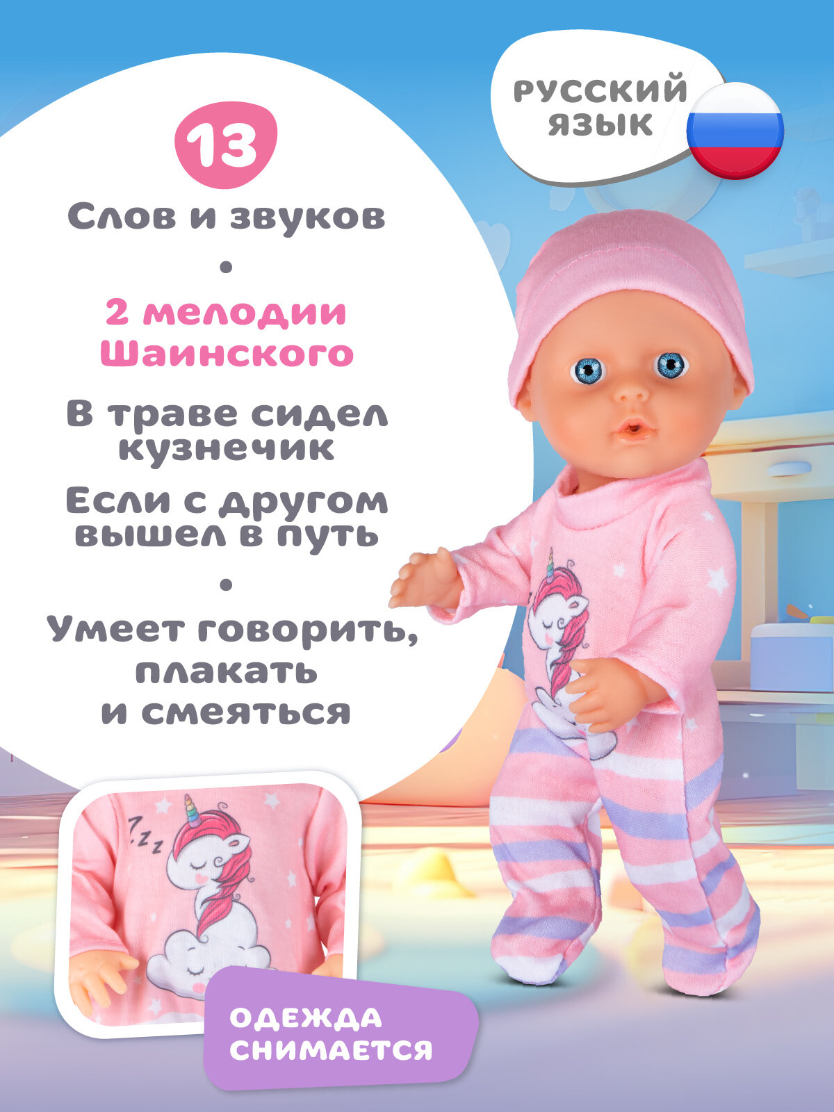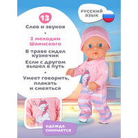 При нажатии на животик – кукла оживает! Она знает 13 разных слов и звуков, среди которых такие милые фразы как "мама", "агу" и "ты самая лучшая!". А еще она умеет пить воду, ходить на горшок, смеяться задорным детским смехом и даже плакать, совсем как настоящий малыш. В ее репертуаре есть две любимые мелодии Владимира Шаинского, которые обязательно вызовут улыбку у детей и взрослых.