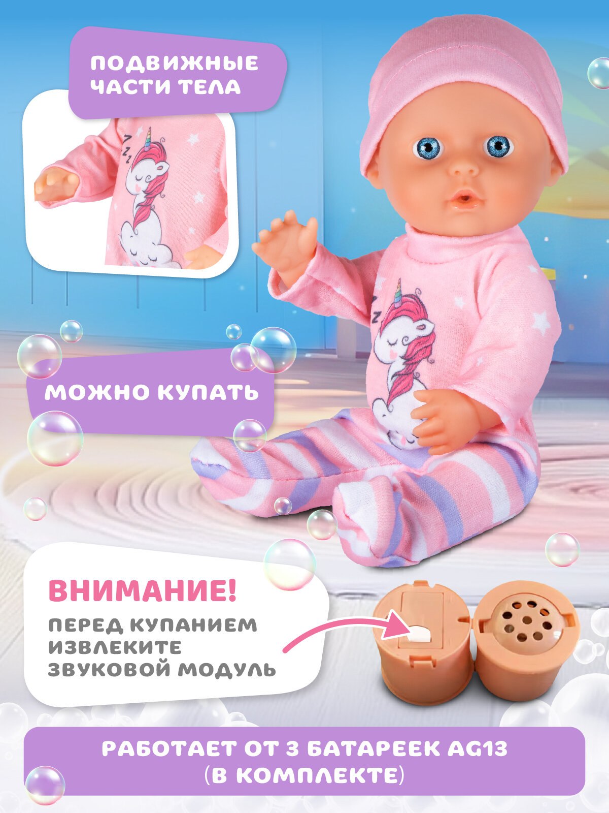 Кукла изготовлена из высококачественных гипоаллергенных материалов, абсолютно безопасна для детей и имеет все необходимые сертификаты. А еще с ней можно купаться – просто не забудьте перед водными процедурами вынуть звуковой модуль, чтобы сохранить электронную "начинку" игрушки.