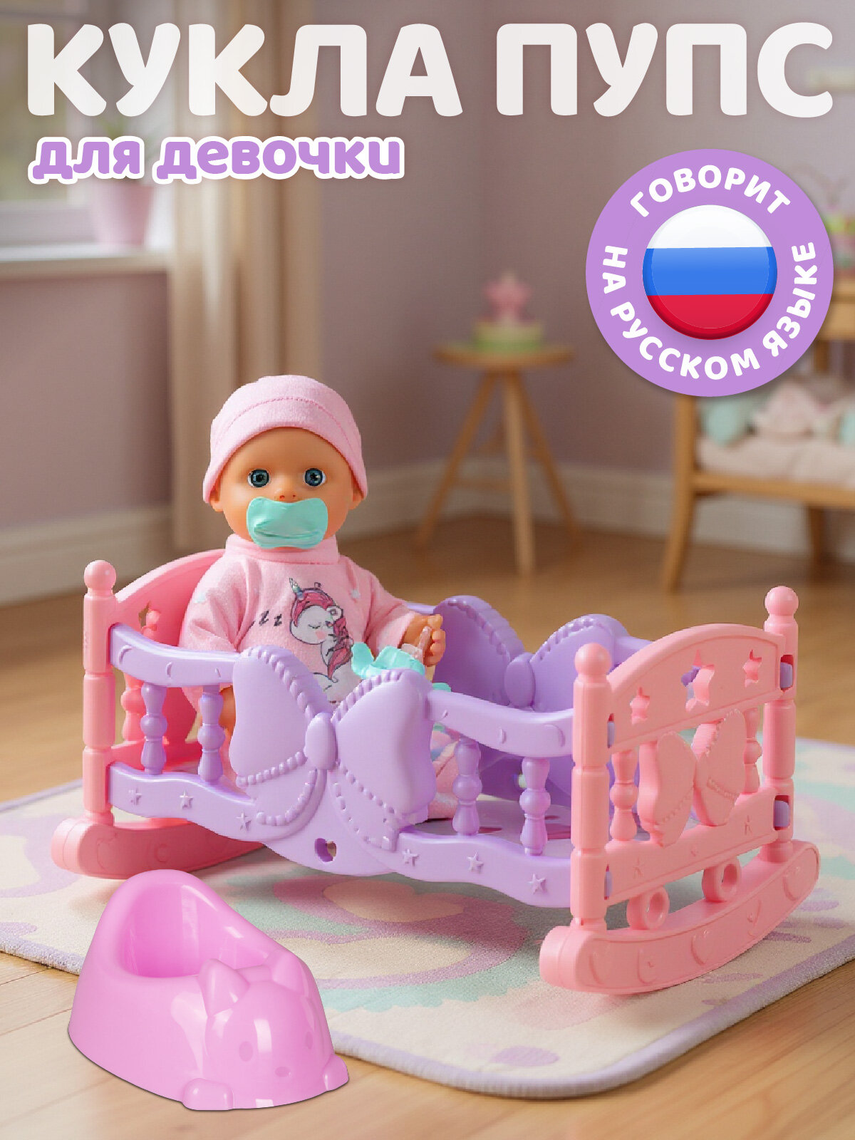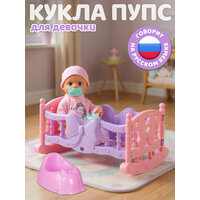 Интерактивный пупс с кроваткой-качалкой и аксессуарами - это настоящий друг, который оживает в руках вашего ребенка! Милый малыш с большими выразительными глазами и нежными румяными щечками умеет разговаривать на русском языке и сидеть, его ручки и ножки подвижны, что делает игру по-настоящему увлекательной.