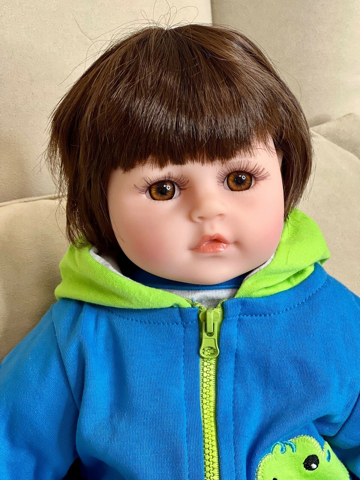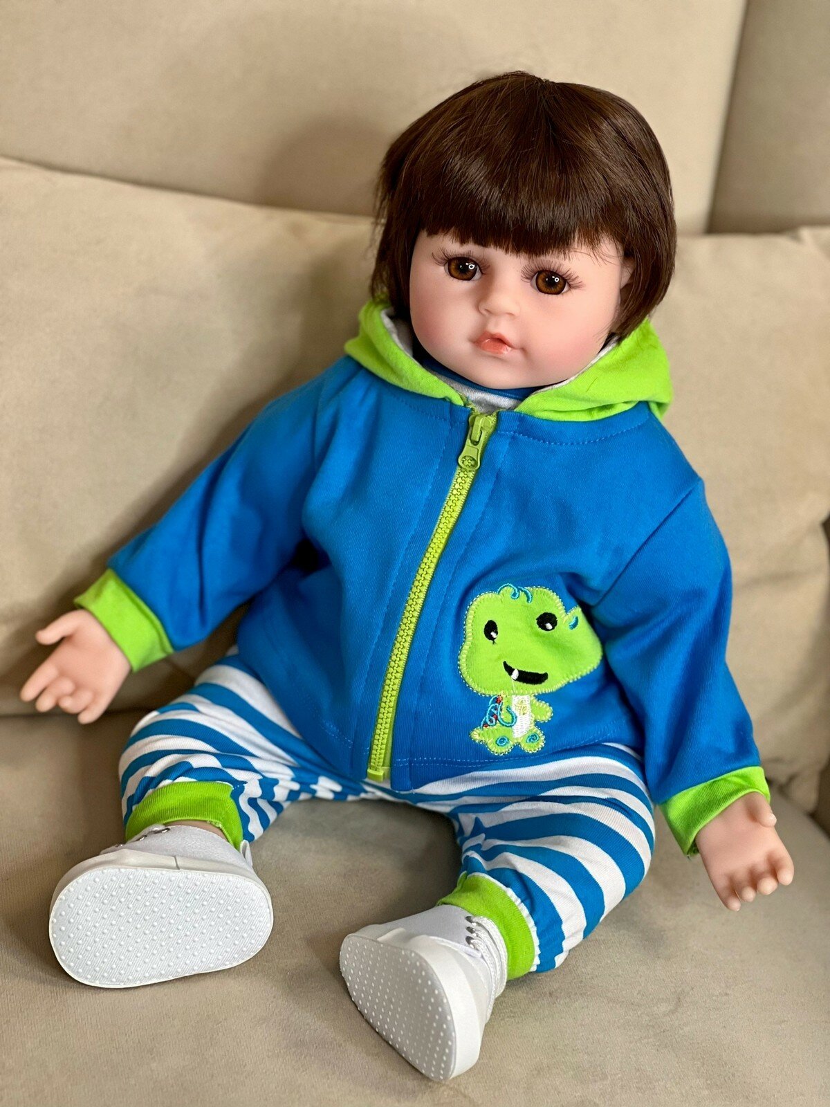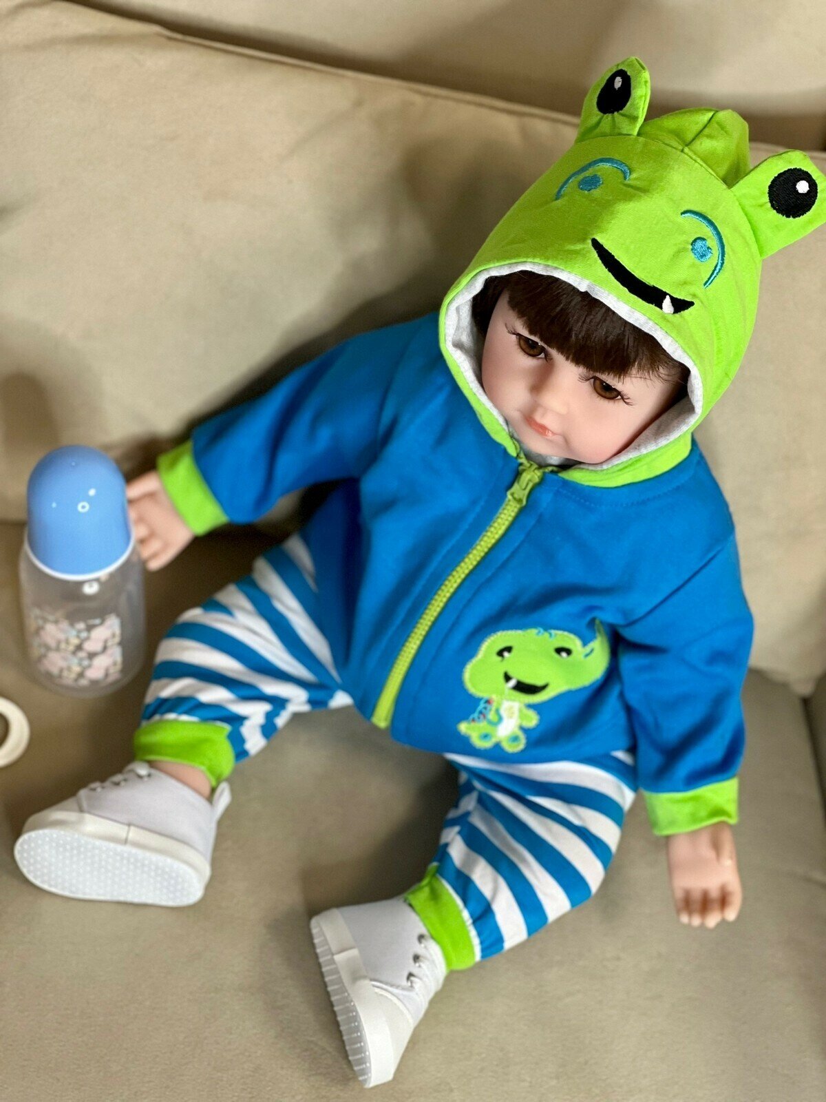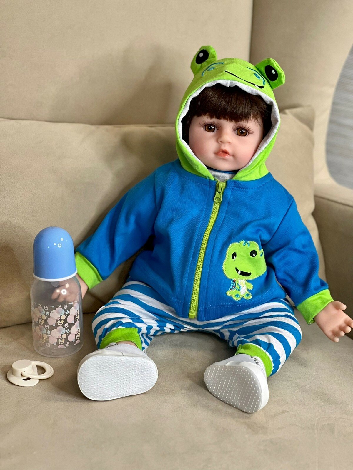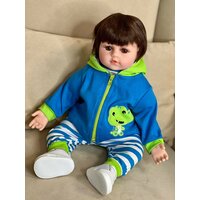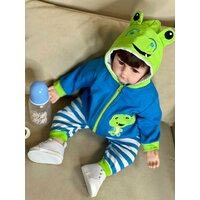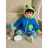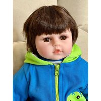 Кукла Реборн от фабрики NPK-TOYS. Мальчик, тело мягко-набивное; ручки, ножки и голова из винил-силикона, все части тела подвижны. Кукла не ароматизирована. Шатен, волосы мягкие (парик). Кукла очень реалистичная, по всему телу имеются складочки, как у настоящего ребёнка, покраснения (ручная роспись). Выразительные акриловые глазки (не закрываются), обрамлены пушистыми ресницами. Глазки тёмные у каждой со своим оттенком (без выбора). Одет - серый ссаышиакой боди, бело-синие полосатые штанишки, сине-зеленая курточка с капюшоном на замке, белые кеды. В комплекте - соска магнитная, бутылочка для кормления. Рост - 48см. Упаковка - пакет (без подарочной коробки). Производитель - Китай (NPK-TOYS).