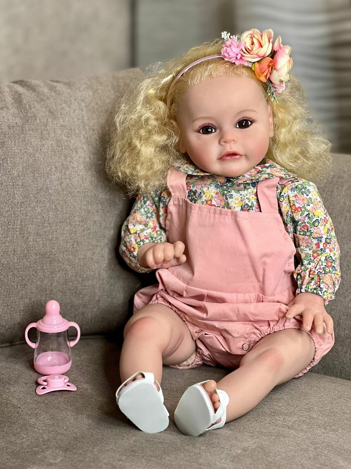 Кукла Реборн от фабрики NPK-TOYS. Кукла реборн. Девочка, тело мягко-набивное; ручки, ножки и голова из винил-силикона, все части тела подвижны (ручки и ножки двигаются за счет дисков). Кукла не ароматизирована. Золотисто-русая блондинка, волосы очень мягкие, максимально приближены к натуральным (не парик, прошивка по всей голове мелкими прядями). Кукла очень реалистичная, по всему телу имеются складочки, как у настоящего ребёнка, покраснения (ручная роспись). Выразительные акриловые глазки (не закрываются), обрамлены пушистыми ресницами. Глазки тёмные у каждой со своим оттенком (без выбора). Одета - цветное комбинированное боди, белые сандалии. В комплекте - бутылочка для кормления, магнитная соска. Сертификат о рождении, где Вы самостоятельно впишите все данные. Рост - 60см. Упаковка - пакет (без подарочной коробки). Производитель - Китай (NPK-TOYS).