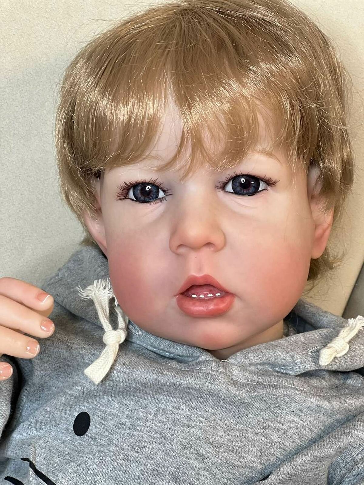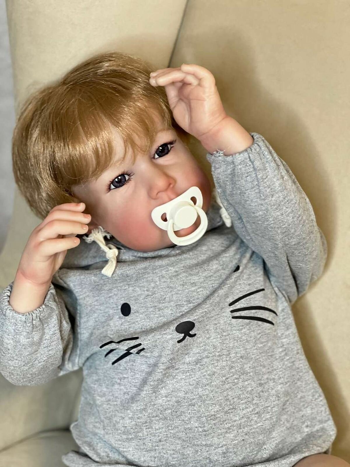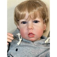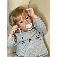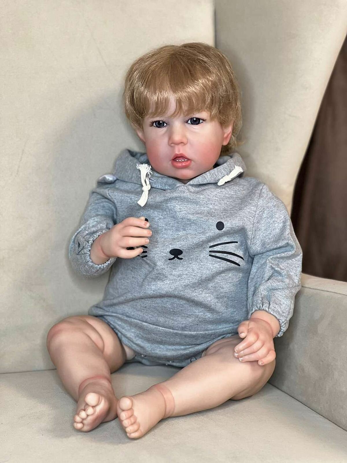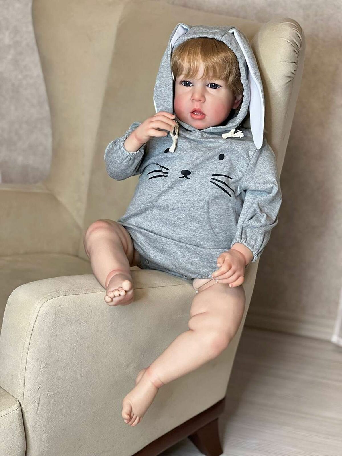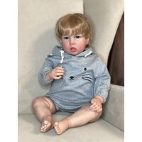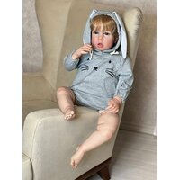 Кукла от фабрики NPK-TOYS. Мальчик, тело мягко-набивное; ручки, ножки и голова из винил-силикона, все части тела подвижны (ручки и ножки двигаются за счет дисков). Кукла не ароматизирована. Русый, волосы очень мягкие, максимально приближены к натуральным (не парик, прошивка по всей голове мелкими прядями). Кукла очень реалистичная, по всему телу имеются складочки, как у настоящего ребенка, покраснения (ручная роспись). Выразительные акриловые глазки (не закрываются), обрамлены пушистыми ресницами. Глазки темные у каждой со своим оттенком (без выбора). Одет - серый боди с капюшоном (капюшон с ушками зайчика, на попе меховой хвостик). В комплекте - бутылочка для кормления, магнитная соска. Сертификат о рождении, где Вы самостоятельно впишите все данные. Рост - 75см. Упаковка - пакет (без подарочной коробки). Производитель - Китай (NPK-TOYS).