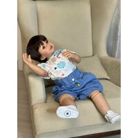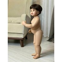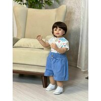 Очень красивый и максимально реалистичный мальчик. Кукла полностью из твердого винила. Все части тела подвижны. Шарнир присутствует в шее и коленях. Голова и конечности крутятся на 360 градусов. Важно! Шарниры дают лишь небольшое сгибание, если усердствовать можно сломать! Кукла может стоять и сидеть самостоятельно. Для определенных поз можно приобрести подставку. Без анатомических половых признаков. Без отдушки. Шатен (парик который приклеен к голове, структура мягкая, можно расчесывать). Акриловые, большие глазки (цвет может отличаться от фото), обрамлены ресницами (глазки не закрываются). Одет - синие шорты, белая с рисунком футболка (можно менять и подбирать свою детскую одежду по росту), кеды на шнуровке (размер ступни примерно 11,5 см). Одежда вся снимается.