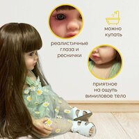 Кукла выполнена из винила, что делает её безопасной для купания. Она имеет твердое тело и может двигать конечностями, что позволяет ей сидеть или лежать, кукла не может стоять. Глаза изготовлены из высококачественного акрила, но не могут моргать. В комплект входит дополнительное оборудование для ухода за куклой, такое как одежда , бутылочка, соска-пустышка, подгузники и свидетельство о рождении, что позволяет детям воссоздавать реалистичные ситуации ухода за малышом. Платье будет точно таким же, как показано на картинке. Вы можете самостоятельно сменить одежду для нее. Новорожденный настоящий размер одежды размера ребенка подходит к кукле. Высота куклы 55 см.