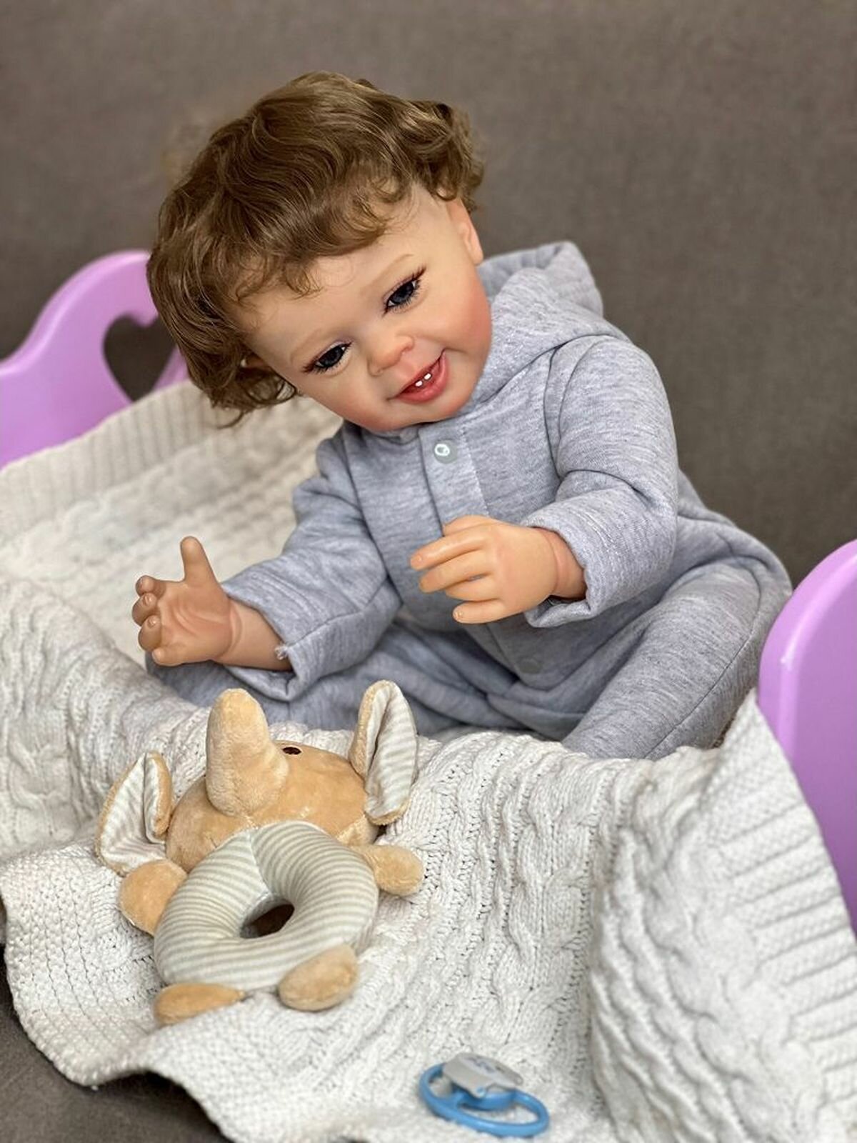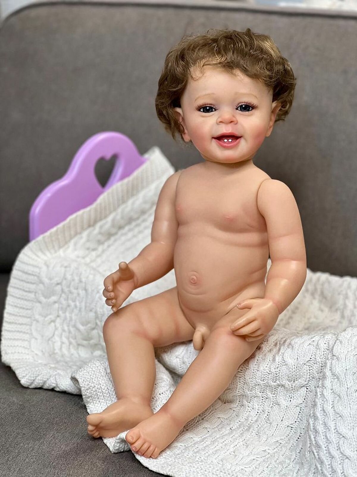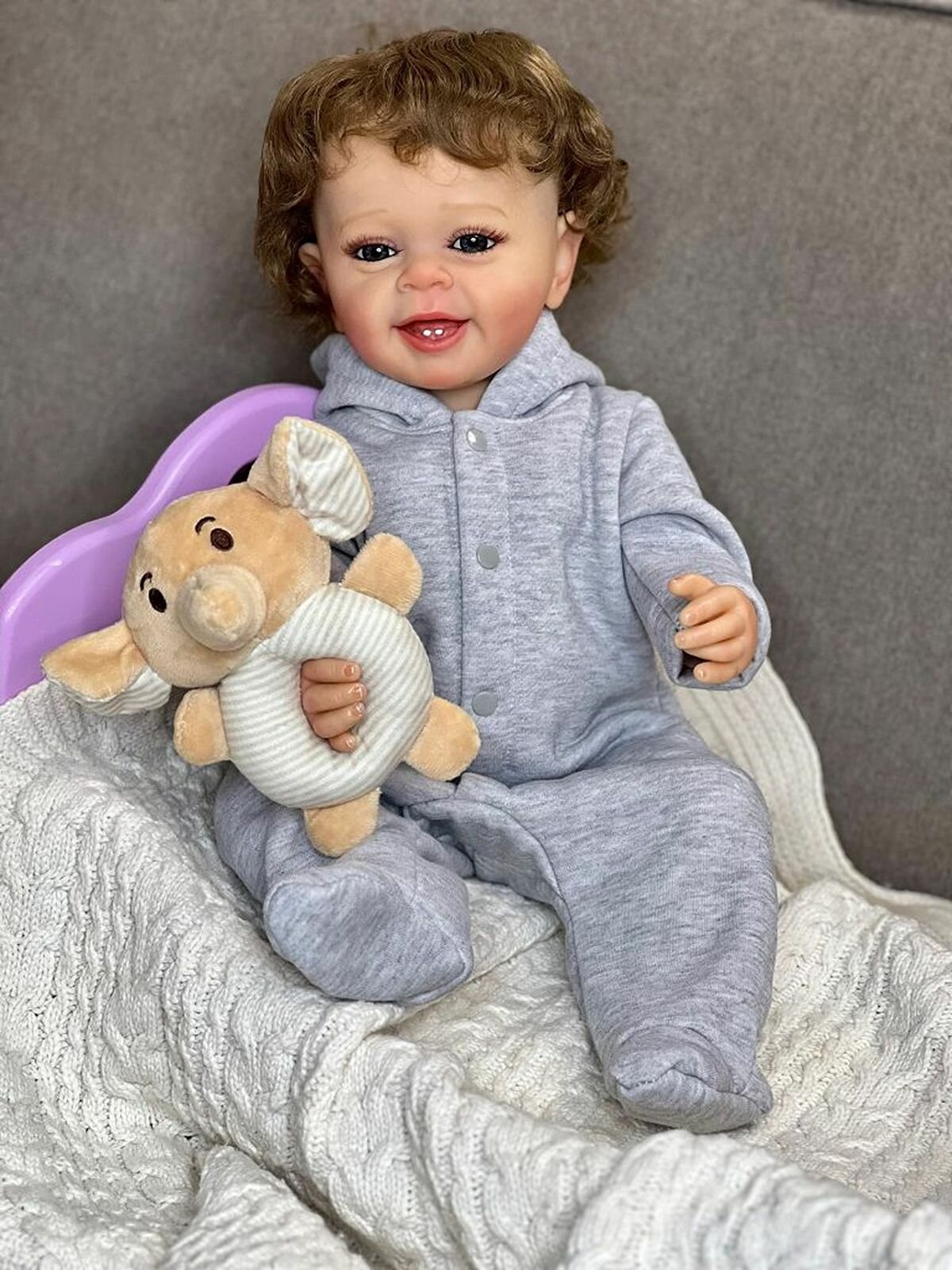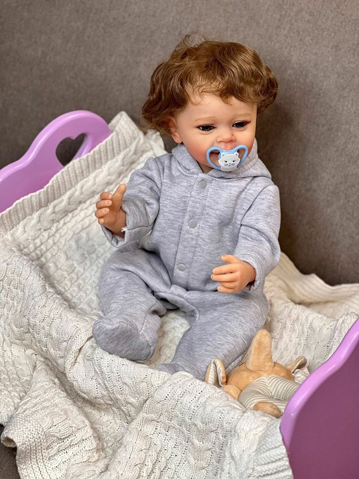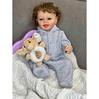 Кукла Реборн от фабрики NPK-TOYS. Мальчик полностью из винил-силикона, все части тела подвижны, с анатомическими половыми признаками. Кукла не ароматизирована. Шатен, волосы очень мягкие, максимально приближены к натуральным (не парик, прошивка по всей голове мелкими прядями). Кукла очень реалистичная, по всему телу имеются складочки, как у настоящего ребенка, венки, покраснения (ручная роспись). Выразительные акриловые глазки (не закрываются), обрамлены пушистыми ресницами. Глазки темные у каждой со своим оттенком (без выбора). Одет - серый, теплый комбинезон с капюшоном. В комплекте - подгузник, бутылочка для кормления, магнитная соска (дизайн и размер может отличаться), мягкая игрушка. Сертификат о рождении, где Вы самостоятельно впишите все данные. Рост - 55см. Упаковка - пакет (без подарочной коробки). Производитель - Китай (NPK-TOYS).