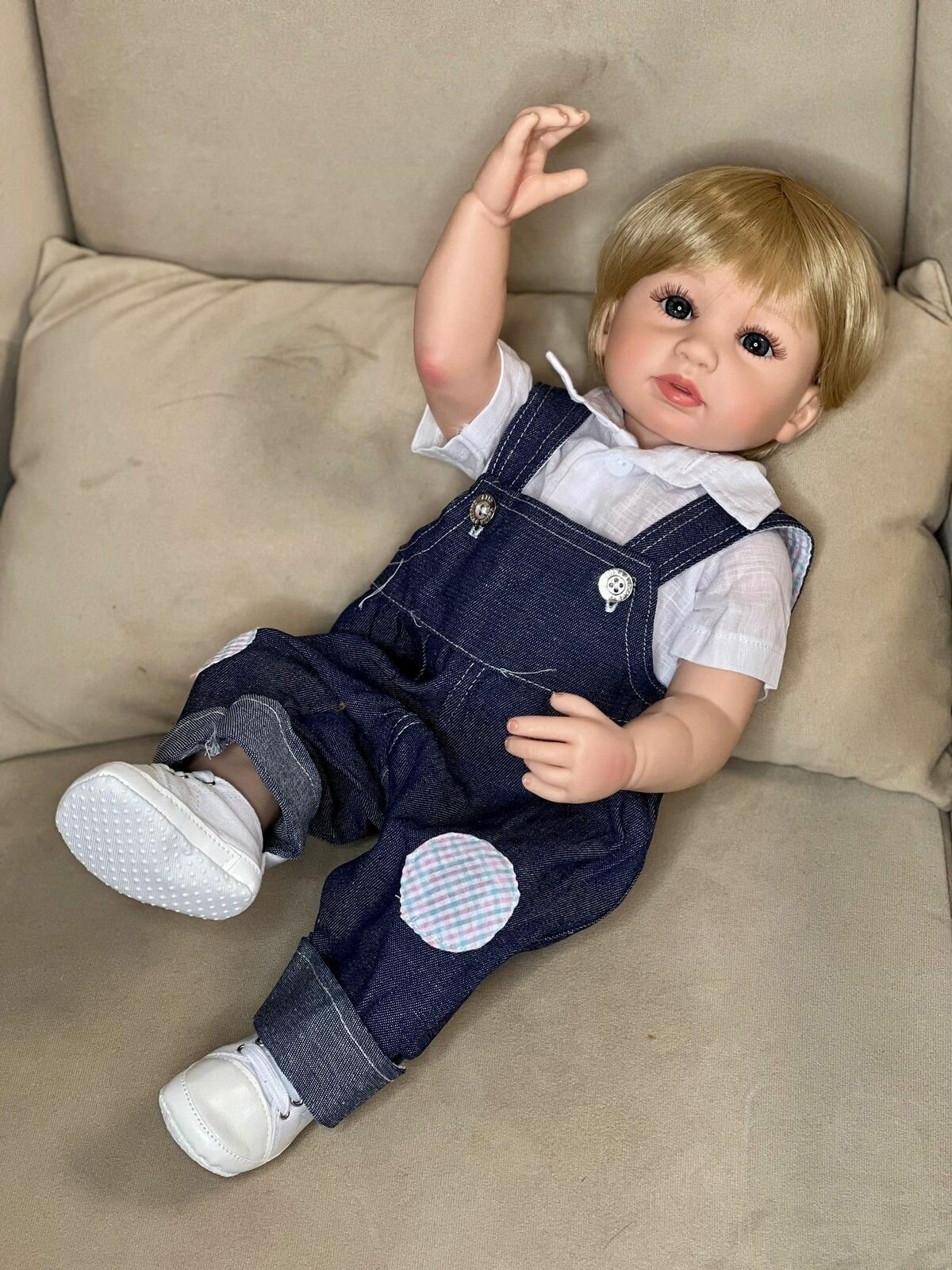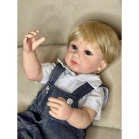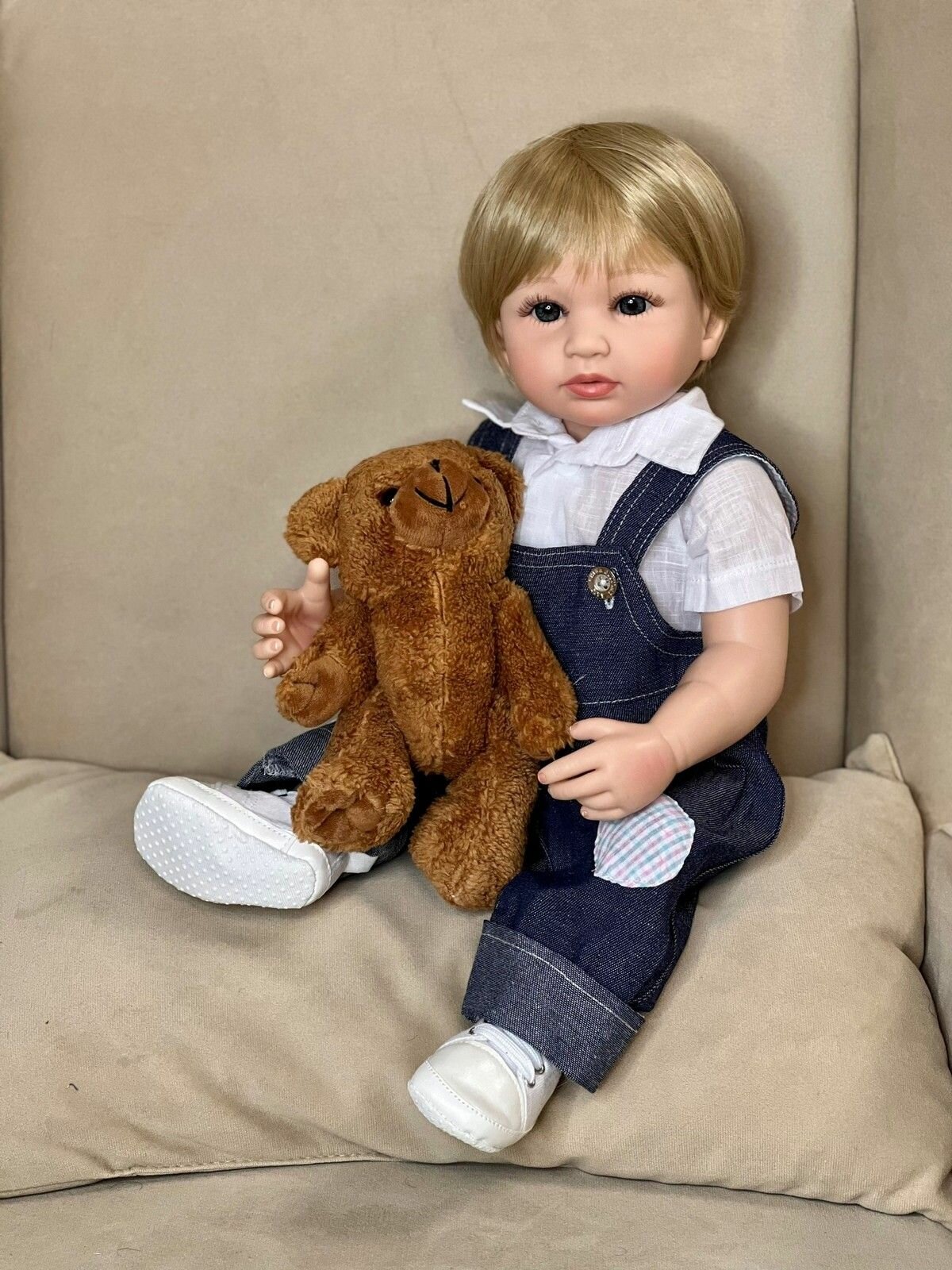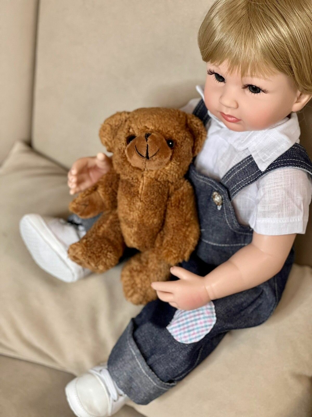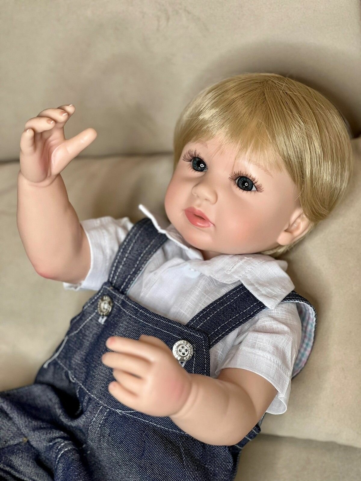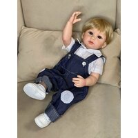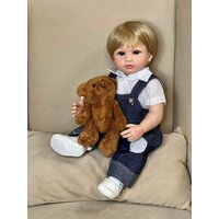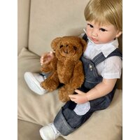 Кукла Реборн от фабрики NPK-TOYS. Кукла реборн. Мальчик полностью из винил-силикона, все части тела подвижны, с анатомическими половыми признаками. Кукла без отдушки. Русый блондин, волосы мягкие (парик). Кукла очень реалистичная, по всему телу имеются складочки, как у настоящего ребёнка, покраснения (ручная роспись). Выразительные акриловые глазки (не закрываются), обрамлены пушистыми ресницами. Глазки тёмные у каждой со своим оттенком (без выбора). Одет - белая рубашка, джинсовый комбинезон, белые кеды на шнуровке. В комплекте - бутылочка для кормления, магнитная соска (вариант и расцветка может отличаться), мягкая игрушка. Сертификат о рождении, где Вы самостоятельно впишите все данные. Рост - 55см. Упаковка - пакет (без подарочной коробки). Производитель - Китай (NPK-TOYS).