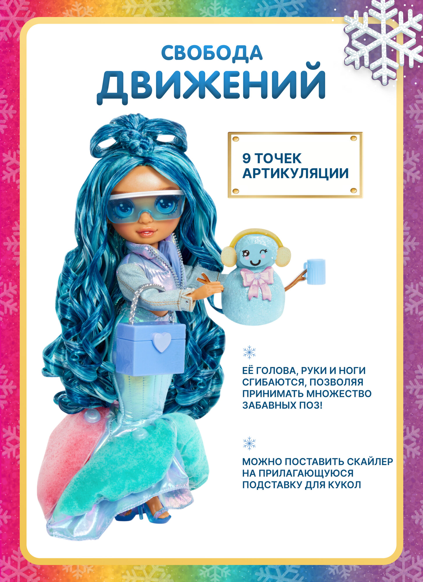 Встречай Скайлер в прекрасном зимнем образе в классической сине-голубой расцветке. А из волшебного снега и забавных аксессуаров ты можешь сделать милого снеговика! Приготовься к снежному веселью вместе с Беллой, Санни, Скайлер и Виолет!