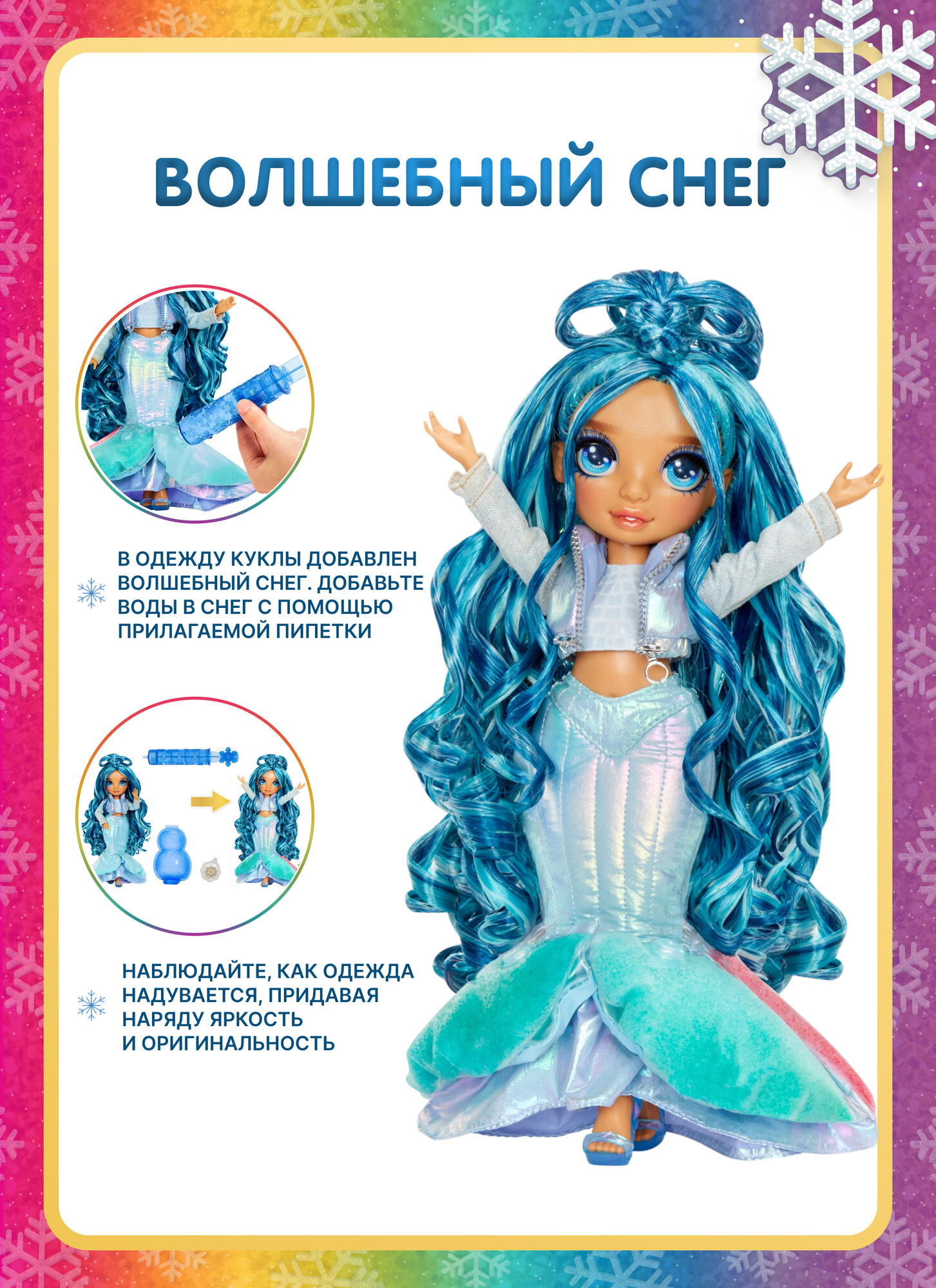 Снежные наряды модных кукол Winter Wonderland не просто великолепно выглядят, но и еще таят в себе волшебный снег, который преображает облик кукол. Просто добавьте воду в складки платья и наблюдайте, как наряды становятся пышными, а их цвета преображаются.