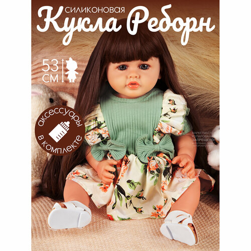 Кукла станет настоящей звездой вашей коллекции и приведет в восторг каждого, кто ее увидит! Кукла создана с большой любовью к деталям: нежные черты лица, мягкие густые волосы, красивые глаза, легкий румянец – кукла выглядит невероятно реалистично. Тело выполнено из высококачественного силикона, который приятен на ощупь и придает ей мягкость. Кукла одета в бодик фисташкого цвета, юбочку в цветочек, сандалики и повязку. Комплектация: кукла, одежда, бутылочка, соска. Не упустите возможность приобрести эту прекрасную куклу для себя или в подарок.