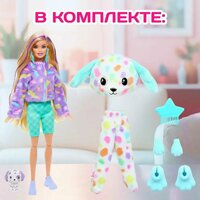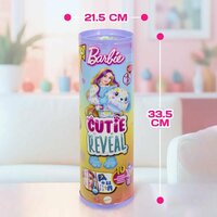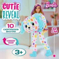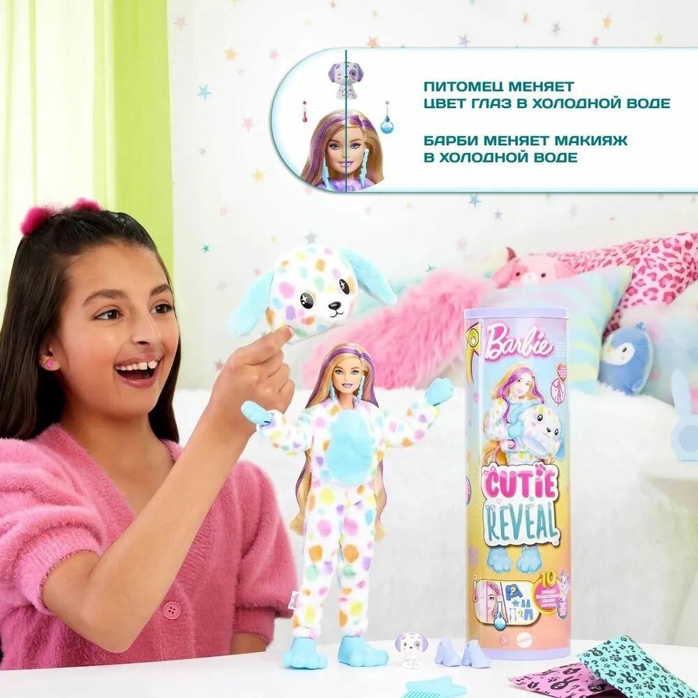 Кукла Милашка-проявляшка Barbie Cutie Reveal – это красавица-Барби, которая спряталась в очаровательном плюшевом костюме далматинца. Откройте все сюрпризы! Особенности: