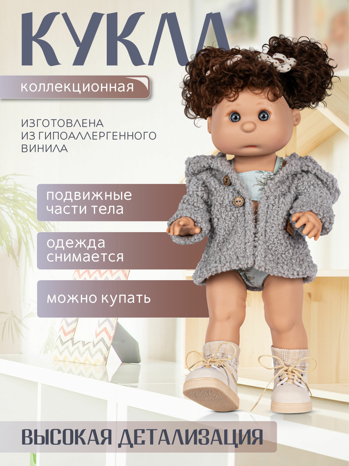 Среди преимуществ виниловой куклы стоит отметить реалистичность и высокую детализацию: выразительные глазки, подвижные ручки и ножки, детально проработанные части тела от ушек до пальчиков – всё продумано до мелочей.