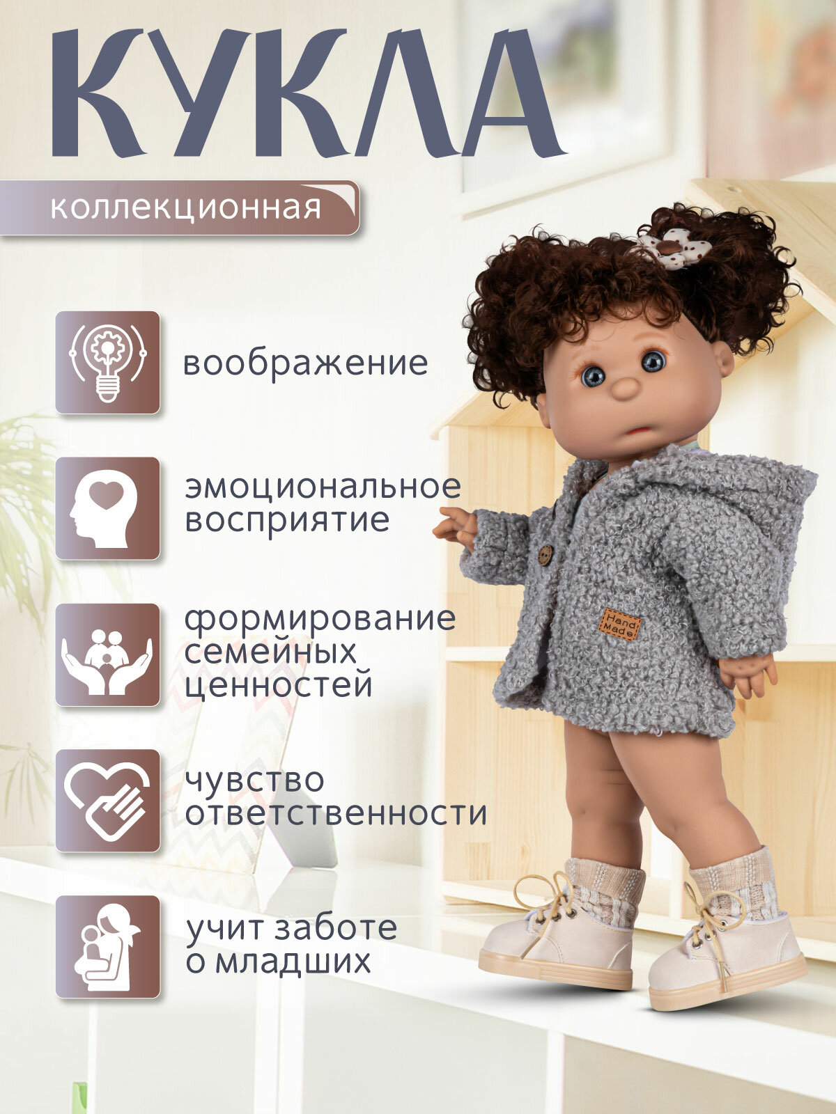 Кукла высотой 37 см выполнена из качественного и безопасного винила.