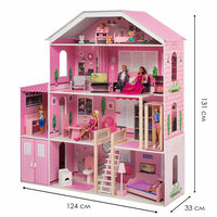 Особенность: Домик, выполнен в классическом девичьем стиле, в благородном нежно розовом цвете. Игрушку отличает нежный, пастельный принт по дереву внутри дома, мощное наполнение аксессуарами и наличие интерактивных элементов. - Домик предназначен для девочек старше трехлетнего возраста - Игрушечный дом для кукол "Поместье Розабелла" частично открытый (задняя стенка глухая, все игровые зоны с лицевой стороны полностью доступны для игры) - Разработан специально для кукол высотой до 30 см (так называемый, Барби-формат) - Размеры домика "Поместье Розабелла" в собранном виде (ДхГхВ): 124 х 33 х 131 см. Вес игрушки: 25 кг. - В комплекте: 23 предметов мебели и аксессуаров. Внимание: Куклы, текстиль приобретается отдельно! - В данной модификации дома – 1 лестница, лифт, гараж, 4 этажа, 6 комнат. - Для декорирования интерьеров используется инновационная технология нанесения рисунка на дерево, благодаря чему декор дома более устойчив к выцветанию и механическим повреждениям во время игры, чем стандартная технология наклеенного и ламинированного бумажного декора. - Упаковка: транспортная картонная коробка