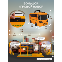 Яркий оранжевый автобус-трансформер — не просто игрушечный домик, а целая школа на колёсах. Автобус легко раскладывается на несколько школьных классов — один на первом этаже, а второй на крыше, к нему ведёт винтовая лестница, создавая уникальную игровую зону.