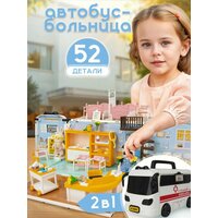 Автобус-трансформер — не просто игрушечный домик, а целая больница на колёсах. Автобус легко раскладывается, образуя больничный корпус — с приемным покоем, регистратурой, зоной отдыха, кабинетом окулиста и палатой с двумя кроватями на крыше, к которой ведет винтовая лестница.