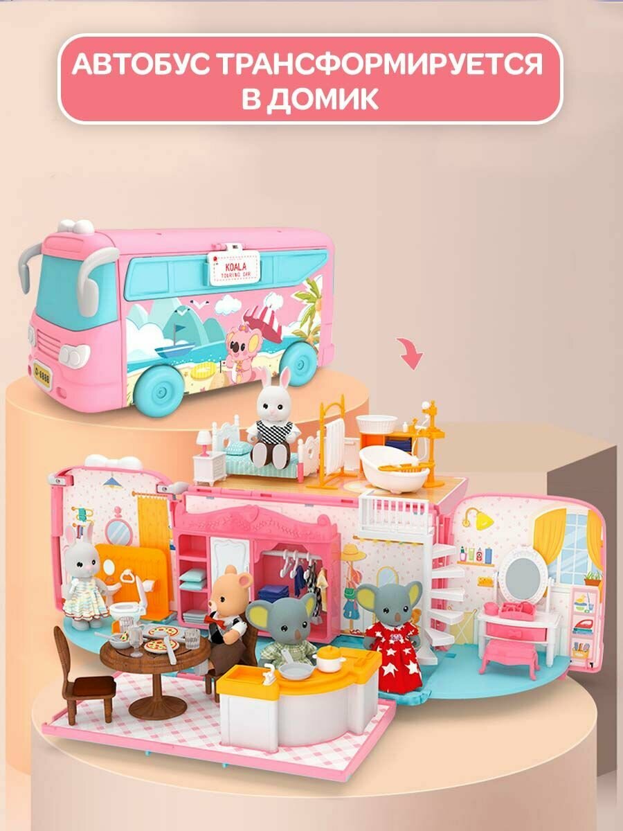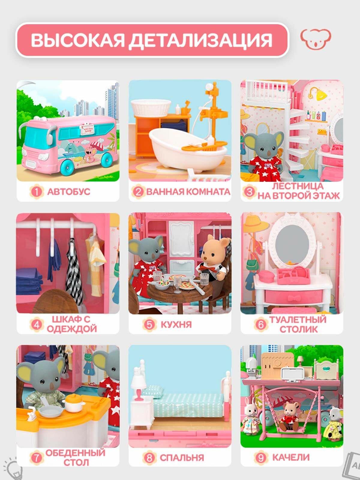 Игрушечный кукольный дом в виде домика на колесах с кухней, спальней и ванной - идеальный подарок для девочек и мальчиков любого возраста на день рождения, 8 марта или 23 февраля. Развивающая детская игрушка в виде автобуса игрушки для лесных животных, благодаря высокой степени детализации заинтересует, приведет в восторг и станет самой любимой игрушкой вашего малыша. Развивающая игрушка для детей домик на дереве имеет высокую степень детализации и реалистичное исполнение, от которого в восторге будут даже взрослые. Красивый построенный дом с мебелью подойдет не только для игр, с его помощью можно украсить детскую комнату. Кукольный домик выполнен из крупных пластиковых деталей, которые надежно крепятся друг к другу и образуют прочную конструкцию. Дом для кукол имеет свою изюминку - мебель и аксессуары, которые придадут ему уют и живость, а ребенку море положительных эмоций во время игры. Красивый построенный sylvanian families дом оснащен качелями, открывающимися окошками, кухней, туалетом, спальней и гардеробной. Уже с первых секунд кукольный дом с современной реалистичной мебелью завладеет вниманием детей, даст им возможность создать настоящий райский уголок для своих миниатюрных персонажей. Обустроить каждую комнату на свой вкус и разыгрывать различные сюжетно-ролевые игры. Помимо мебели, в набор включена 1 миниатюрная милая фигурка коала сюрприз. Такие эффекты придадут детскому домику уют и живость, а детям подарят море положительных эмоций во время игры. Мебель и красочные дополнительные аксессуары с первых секунд завладеют вниманием вашего малыша. Дети смогут устроить веселый пикник под деревом возле домика, покататься на качелях, и отправиться в путешествие на автобусе. После игры ребенок сможет аккуратно собрать внутрь всю игрушечную мебель и аксессуары. Игрушечный автобус трансформер для девочек имеет ручку на крыше, что позволит брать его с собой на прогулки, в детский сад и на дачу. Играя с домиком, ваш ребенок будет развивать различные навыки. Ребенок научится концентрироваться и улучшит координацию движений. Сборная модель дома для кукол объемная и помогает совершенствовать пространственное мышление. Игры с уже собранным игрушечным домом для кукол расширяют кругозор и дают возможность придумать новые сюжеты и сценарии для персонажей. Большие детали без острых углов выполнены из качественного, безопасного для здоровья пластика, который прослужит не один год. Яркие и блестящие детали помогут построить красивый дом, который подойдет для игр с разными куклами. Подвижные элементы сделают игру более увлекательной и интересной. Интерактивная игрушка упакована в большую красочную коробку, которая станет настоящим сюрпризом и произведет на вашего малыша настоящий вау-эффект. Выбирайте кукольный домик для девочек или мальчиков и проводите время с детьми, создавая сказочные постройки для мини-фигурок. В нашем каталоге WiMi вы найдете большой ассортимент развивающих наборов для своих детей. Мы будем рады, если вы оставите отзыв и фото на странице товара.