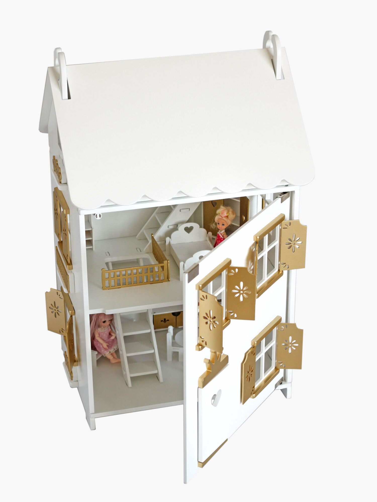 Игрушечный деревянный дом, компактный и функциональный в 3 этажа и 3 комнаты, в нем 9 окон, лестница и перила. Расстояние между полками 22 см. Игровая зона с одной стороны, что позволяет удобно играть одному малышу, и в тоже время придумывать сюжетно-ролевые игры. Девочки проявят фантазию в расставлении набора мебели для кукол внутри спальни столовой, а также гостиной. Родители могут убедиться, подарок прекрасно подходит в современный и классический интерьер детских, имеет белоснежный цвет с золотым декором. Где малыш разместит фигуры своих героев принцесс лол фей сильваниа зайчиков медвежат котят и откроет реалистичный мир. Подойдет для детской комнаты, где творчество и представление о сказочных персонажей будут открывать новый вид. Дом похож на огромный коттедж, который легко собирается и разбирается как конструктор, экологически безопасный, без заусенцев и запахов с понятной инструкцией для сборки. Стенки фасада, а также крыша открываются и дают свободный доступ для игры внутри. Размер: высота 77 см, ширина 48 см. глубина 42 см. Тогда соберется полный комплект. Ребенок получит долгожданный сюрприз. Приятных покупок. Приобретая наш продукт, вы увидите не только качественное и сертифицированное изделие, а также восторг, радость и яркие эмоции вашего ребенка. Произведено в России из качественных материалов с любовью и заботой.