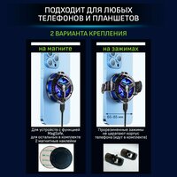 Игры с крутой графикой без лагов и фризов? Просмотр фильмов без перегревов? Длительные прямые эфиры и стримы без зависаний и багов? Это реально. Магнитный кулер для телефона поможет твоему гаджету раскрыть свой потенциал. Даже самые современные высокопроизводительные устройства лишены полноценной системы охлаждения. И при высокой нагрузке процессор нагревается. Из-за этого во время игры пальцы начинают потеть, экран теряет яркость, а видеоигра лагает. Мощный внешний охладитель - это спасение для геймера и любого человека, активно пользующегося смартфоном. Полупроводниковый кулер – это конструкция, состоящая многих компонентов, которые, как кондиционер, мгновенно охлаждают девайс. Первый слой – силиконовая прокладка для теплообмена. Далее охлаждающая алюминиевая пластина и платформа с зажимом. Над ними размещен элемент Пельтье, который обеспечивает постоянный контроль температуры. В корпус умного охлаждателя встроен девятилопастной вентилятор 5000 об/мин и яркая RBG подсветка, создающая атмосферу погружения в игру, которую при необходимости можно отключить. . Кулер маленький и бесшумный. Он легко примагничивается к айфонам с функцией MagSafe. Если ее нет, приклей к гаджету металлическую пластину, к которой магнитится кулер (есть в наборе). Так ты сможешь использовать охладитель на любом смартфоне и планшете. Также есть прорезиненное раздвижное крепление, не царапающее корпус, оно подходит для телефонов системы android и iphone шириной до 85 мм. Чтобы получить эффект, пользуйся кулером с телефоном без чехла. Корпусный мини cooler работает от сети через USB кабель с разъемом Type-C (в комплекте). Играй в PUBG, Genshin Impact, Freefire, Call of Duty mobile, Fortnite, Standoff 2, Devil May Cry, Assassin s creed без просадки FPS. В подарок игровые напальчники. С ними твои пальцы будут лучше скользить по экрану. Кулер – отличное решение для любителей мобильного гейминга и киберспорта. Выжми из своего смартфона максимум!