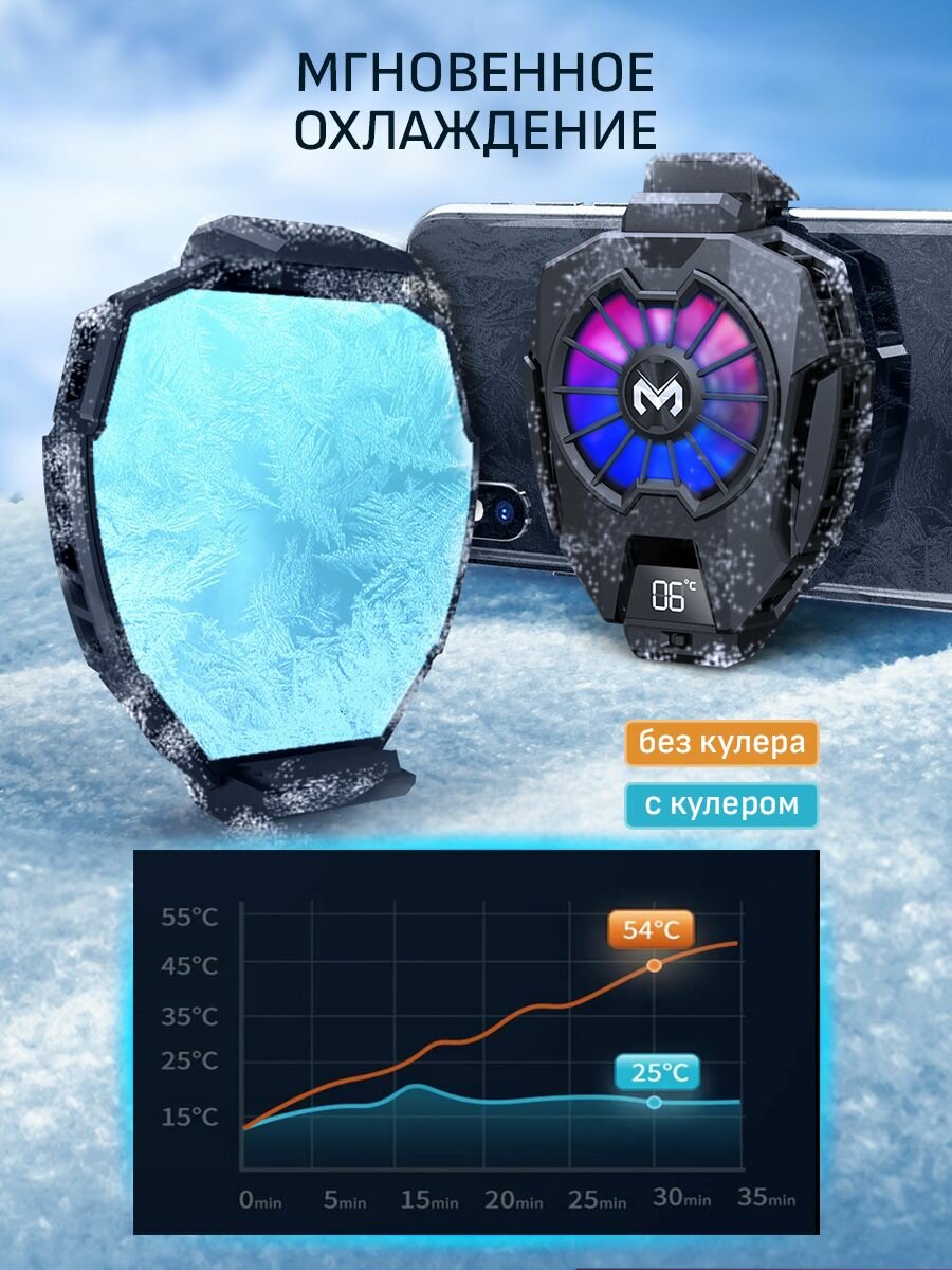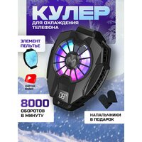 Игры с крутой графикой без лагов и фризов? Просмотр фильмов без перегревов? Длительные прямые эфиры и стримы без зависаний и багов? Это реально. Кулер для телефона поможет твоему гаджету раскрыть свой потенциал. К сожалению, даже самые современные высокопроизводительные устройства лишены полноценной системы охлаждения. И, при высокой нагрузке, процессор нагревается. Из-за этого во время игры пальцы начинают потеть, экран теряет яркость, видеоигра лагает, мобильник не тянет. Установка мощного внешнего охладителя - это спасение для геймера и любого человека, активно пользующегося смартфоном. Полупроводниковый кулер – лучший выбор на рынке. Это не просто вентилятор, который гоняет горячий воздух. Это сложная конструкция, состоящая многих компонентов, которые, как кондиционер, мгновенно охлаждают девайс. Ближайший к телефону слой – силиконовая прокладка для теплообмена. Далее охлаждающая алюминиевая пластина и платформа с зажимом. Над ними размещен элемент Пельтье, который обеспечивает постоянный контроль температуры. В корпус умного охлаждателя также встроен девятилопастной вентилятор 8000 об/мин и яркая RBG подсветка, создающая атмосферу погружения в игру. Кулер достаточно маленький и бесшумный. Он плотно прикрепляется смартфону с помощью прорезиненных раздвижных креплений, которые не царапают корпус. Подходит для 98% телефонов системы android или iPhone шириной до 85 мм. Чтобы получить эффект, пользуйся кулером с телефоном без чехла. Корпусный cooler работает от сети через USB кабель с разъемом Type-C, который входит в комплект. Играй в PUBG, Genshin Impact, Freefire, Call of Duty mobile, Fortnite, Standoff 2, Devil May Cry, Assassin s creed без просадки FPS. В подарок игровые напальчники. С ними твои пальцы будут лучше скользить по экрану, а сенсор станет более чувствительным к нажатиям. Миникулер для смартфона – отличное решение для любителей мобильного гейминга и киберспорта. Используй свой смарт на 100%, выжми максимум производительности!