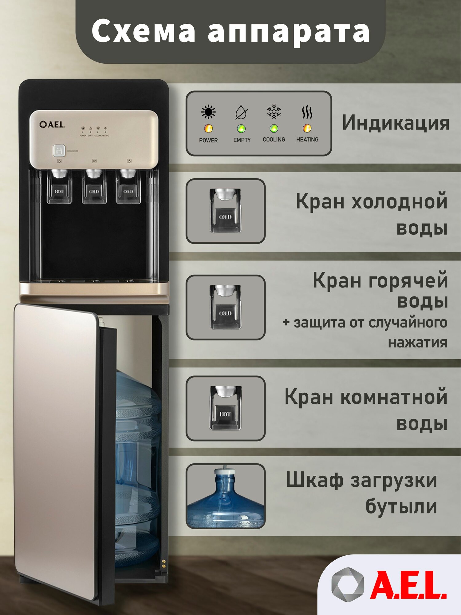 Купить Кулер для воды AEL LD 806a, черно-золотой с нижней загрузкой бутыли с доставкой по всей России. Кулер для воды AEL LD 806a, черно-золотой с нижней загрузкой бутыли: сравнение цен, характеристики, фото, актуальное наличие и цены.