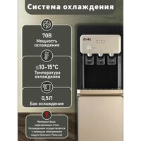 Напольный кулер для воды LD 806a с нагревом и электронной системой охлаждения. Корпус диспенсера выполнен из металла и высококачественного пластика черного цвета с золотыми вставками. Производительность аппарата позволяет всего за один час охладить 0.7 литра воды, а также подготовить 5 литров кипятка. Модель оснащена тремя кранами типа "нажим кружкой" для подачи воды (холодная/горячая/комнатная). Отслеживать режимы работы удобно благодаря наличию индикаторов на лицевой панели кулера. При необходимости функции нагрева и охлаждения можно отключить с помощью тумблеров, расположенных на задней панели устройства. Модель оборудована системой защиты от случайного ошпаривания (защита от детей). Нижняя установка бутыли. Аппарат предназначен только для использования чистой бутилированной